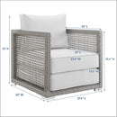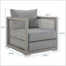 Weave conversational threads into a rollicking good time with Aura Outdoor Patio Armchair. Aura comes with a synthetic gray-on-gray tone wicker rattan weave and a powder-coated aluminum frame that delivers a softly versatile outdoor collection that shifts to meet the needs of the moment. Outfitted with machine washable and fade resistant all-weather fabric cushions, and designed with an extra wide and deep body, Aura will make your outdoor spot the focal point of good memories and festive gatherings while enhancing your patio, backyard or poolside arena. Featuring thick cushions and chrome plated anti-skid feet, enjoy spacious seating and enhanced comfort with this reliable piece of outdoor furniture. Comes fully assembled.