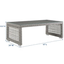 Weave conversational threads into a rollicking good time with Aura Outdoor Patio Coffee Table. Aura comes with a synthetic gray-on-gray tone wicker rattan weave and a powder-coated aluminum frame that delivers a softly versatile outdoor collection that shifts to meet the needs of the moment. Outfitted with tempered glass top, and designed with an extra wide and deep body, Aura will make your outdoor spot the focal point of good memories and festive gatherings while enhancing your patio, backyard or poolside arena. Featuring chrome plated anti-skid feet, enjoy spacious seating and enhanced comfort with this reliable piece of outdoor furniture.