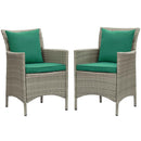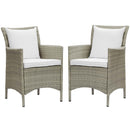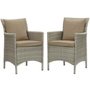 Refresh your alfresco space with the Conduit Outdoor Patio Dining Arm Chair Set of 2. Bringing transitional style with contemporary modern flair to any outdoor area, Conduit Outdoor Dining Arm Chairs feature powder-coated aluminum frames wrapped in synthetic UV-resistant wicker rattan. Foam padded cushions and waterproof covers offer a comfortable seat while dining or entertaining. All-weather and long lasting, this versatile outdoor dining chair creates a serene setting for your morning tea, sunny lunch, sunset cocktail, and everything in between.