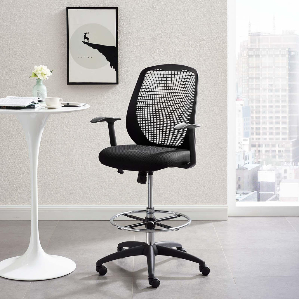Sit in style with the Intrepid Drafting Chair. Designed with a sturdy nylon base and sleek design, Intrepid features a breathable nylon grid design back and padded mesh seat for reliable, ergonomic support. Equipped with five dual-wheel casters, 360� swivel, extra tall gas cylinder, adjustable chrome-plated footring, and tilt tension knob, Intrepid is a versatile drafting chair for working, drafting, drawing, or playing a musical instrument. Perfect for the office, studio, lab, or reception area. Chair Weight Capacity: 331 lbs.