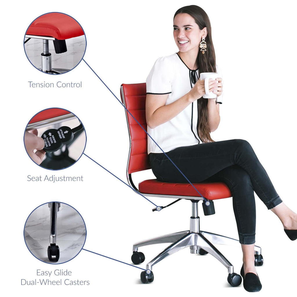 Steer the course and sail to an island called style. Jive is the result of chair makers who decided to design a chair that just works. Functionally, it is a pleasure to sit in as the durable ribbed vinyl back provides natural posture support. The seat cushion comes well padded, while the armless construction makes this a perfect piece for conference rooms and desk work. Jive�s chrome-plated aluminum base is fitted with five dual-wheel casters, while a tension knob and tilt lock allow for easy back position adjustments. This is a chair made for the modern office and a welcome embodiment of the spirit of progress and determination.