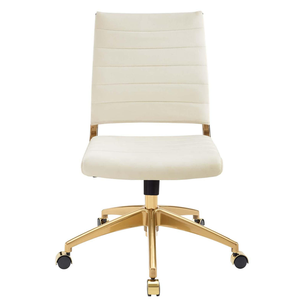 Steer the course and sail to an island called style. Jive is the result of chair makers who decided to design a chair that just works. Functionally, it is a pleasure to sit in as the durable ribbed velvet back provides natural posture support. The seat cushion is padded and upholstered in stain-resistant performance velvet. This armless office chair's chrome-plated aluminum base is fitted with five dual-wheel casters, while a tension knob and tilt lock allow for easy back position adjustments. This is an armless desk chair made for the modern office and a welcome embodiment of the spirit of progress and determination. Set Includes: One - Jive Armless Mid Back Office Chair Mid Back Modern Armless Office Chair Chrome-Plated Aluminum Frame Padded Performance Velvet Seat Tilt Lock With Tension Control Fully Height-Adjustable Five Dual-Wheel Caster Base Assembly Required Overall Product Dimensions: 26.5"L x 19"W x 34.5 - 37"H Seat Dimensions: 20"L x 19"W x 17.5 - 20"H Backrest Dimensions: 17.5"W x 18.5"H Cushion Thichkness: 2"H Base Dimension: 26.5"L x 26.5"W