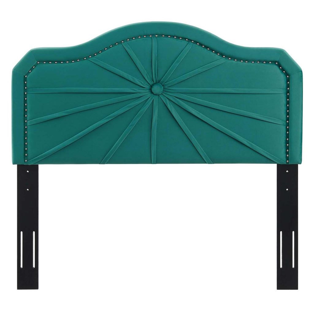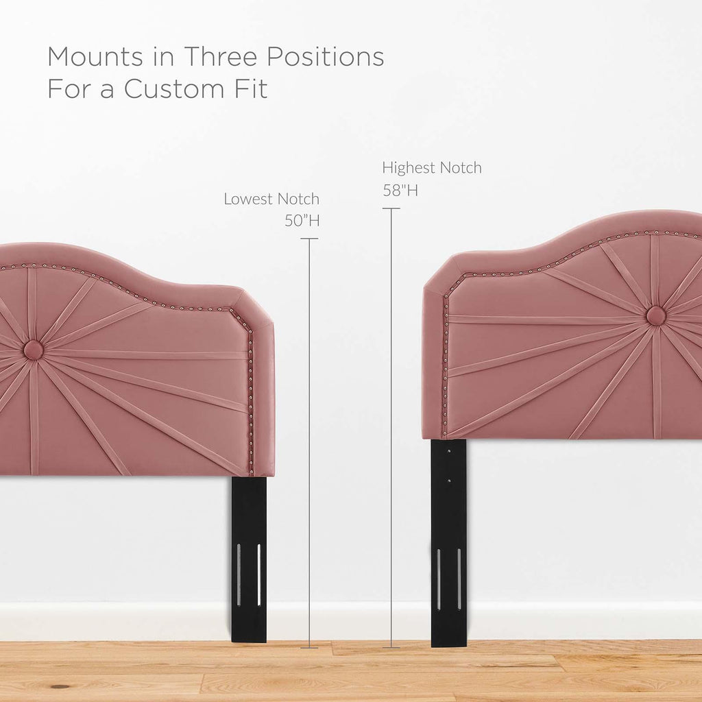 Infuse your master bedroom or guest bedroom with the vintage modern elegance and glam deco style of the Kristin Performance Velvet Full/Queen Headboard. Featuring luxe velvet texture, an arched shape, nailhead trim, and a pleated design, this full or queen size headboard is a beautiful update. Upholstered in soft, stain-resistant performance velvet, this padded headboard offers supportive comfort while sitting up in bed resting, relaxing, reading, or watching TV. A beautiful backdrop for a variety of bedding styles, this adjustable headboard fits almost any full or queen bed with its three mounting positions. Assembly required.