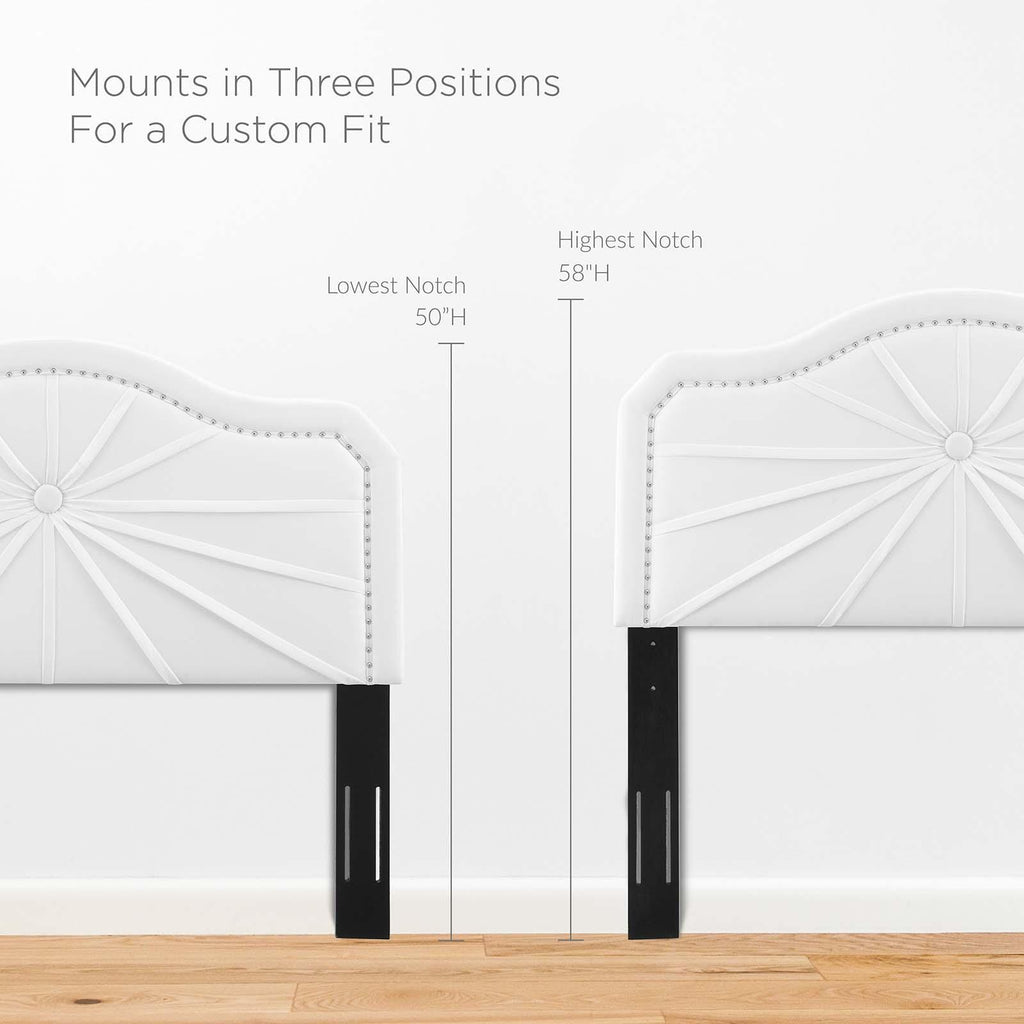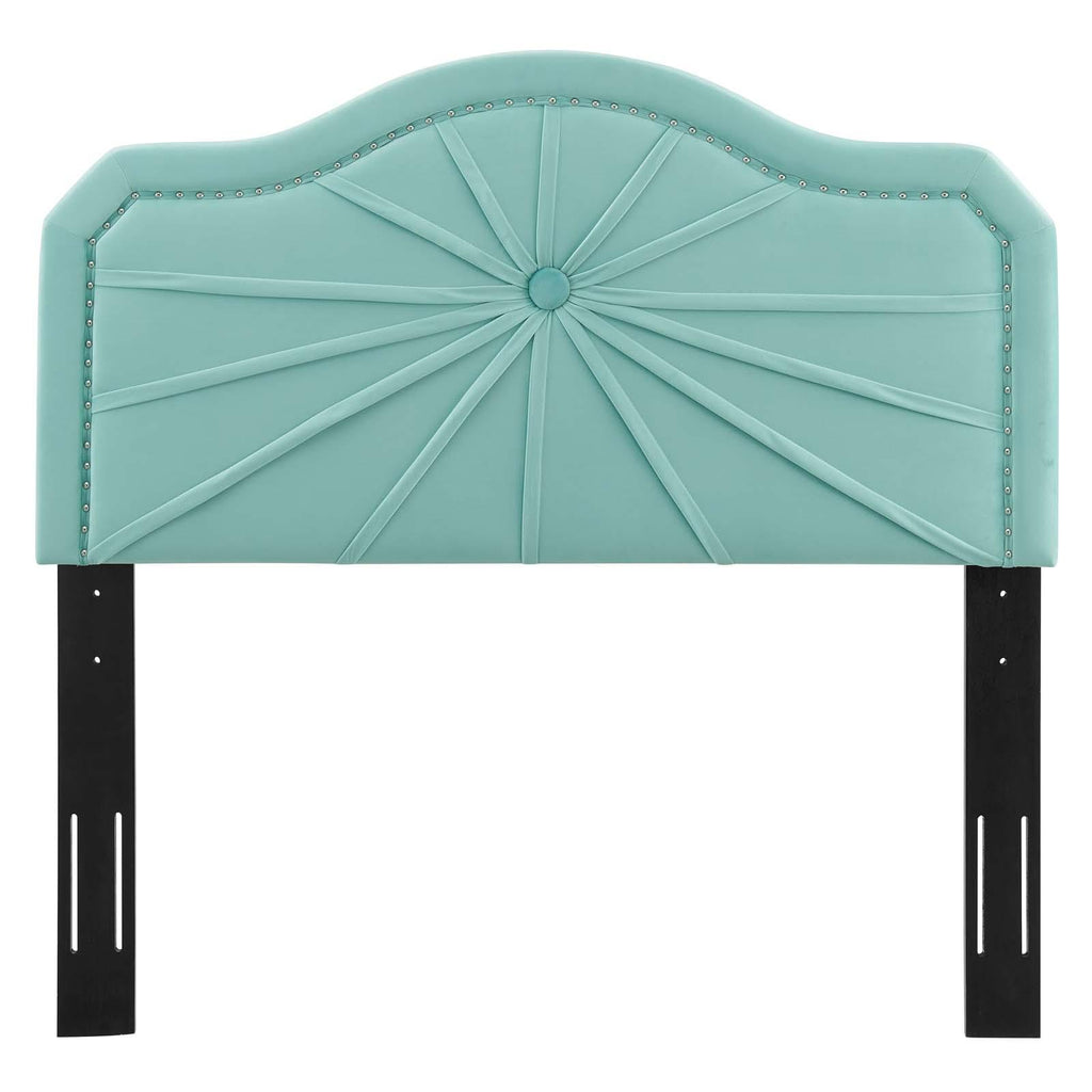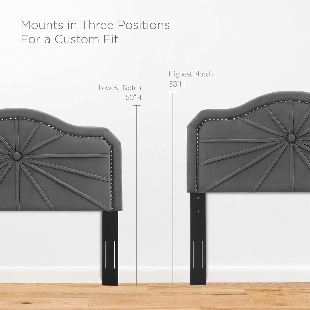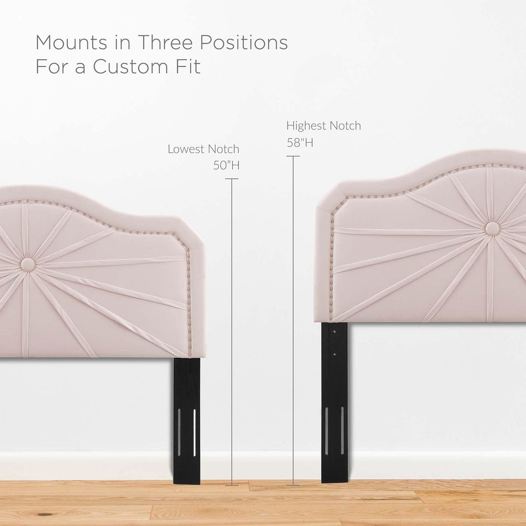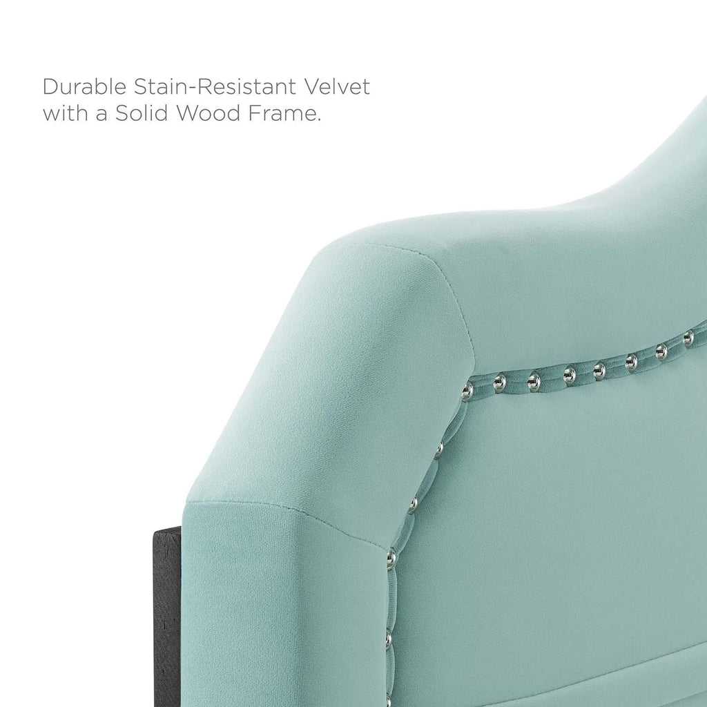 Infuse your master bedroom or guest bedroom with the vintage modern elegance and glam deco style of the Kristin Performance Velvet King/California King Headboard. Featuring luxe velvet texture, an arched shape, nailhead trim, and a pleated design, this king/Cali king size headboard is a beautiful update. Upholstered in soft, stain-resistant performance velvet, this padded headboard offers supportive comfort while sitting up in bed resting, relaxing, reading, or watching TV. A beautiful backdrop for a variety of bedding styles, this adjustable headboard fits almost any king or California king bed with its three mounting positions. Assembly required.