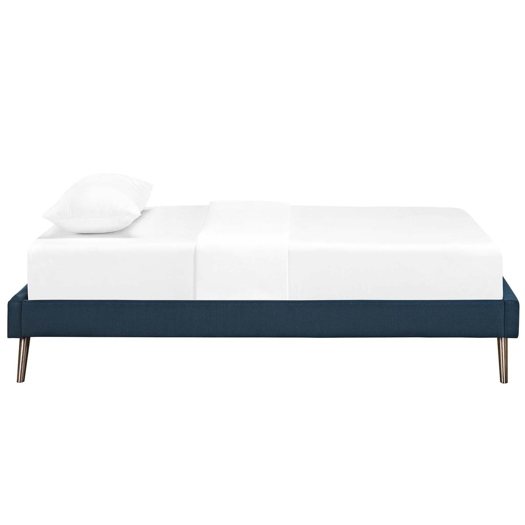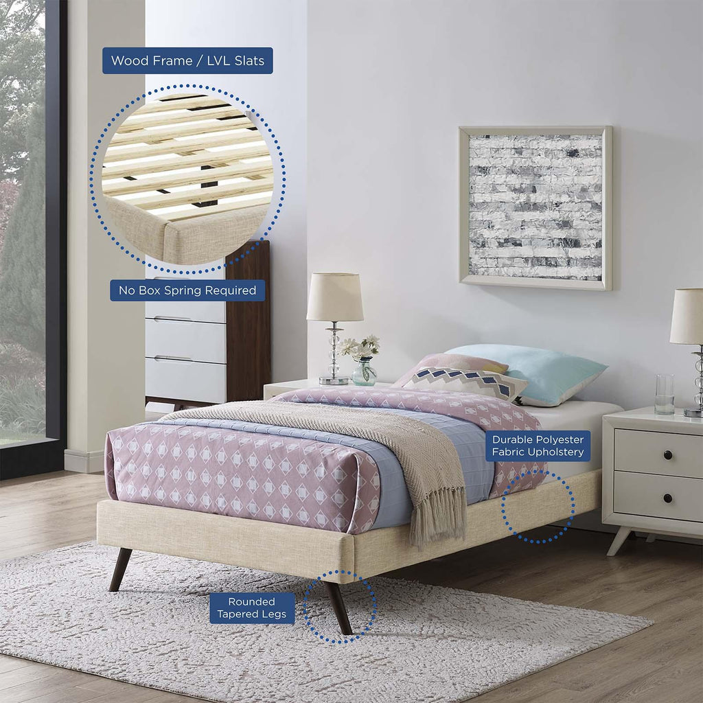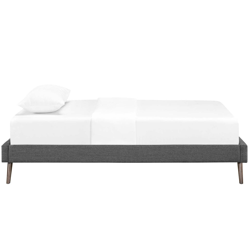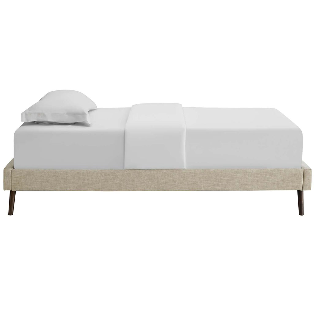 Accelerate your bedroom decor with the Loryn Platform Bed. Made with a solid wood frame upholstered in polyester fabric, Loryn features tapered wood legs, plastic foot glides, ten sturdy wood slats with a centered supporting bar and two support legs for enhanced stability. Due to the wooden slat support system, the use of a box spring is unnecessary. Loryn supports memory foam mattresses such as our Aveline series, and is compatible with one of our headboard styles: Jessamine, Terisa, Laura, Phoebe, Camille, and Josie. Perfect for mid-century modern, minimalist and contemporary bedrooms. Mattress not included. Set Includes: One - Loryn Bed Frame Solid Wood Frame Upholstered in Polyester Ten Wood Support Slats Center Rail with Support Two Legs Non-Marking Foot Glides Mattress Not Included Assembly Required Overall Product Dimensions: 80.5"L x 42.5"W x 13"H Long Board Dimenions: 76"L x 6"W x 1"H Short Board Dimensions: 42.5"L x 6"W x 2.5"H Headboard Dimensions: 2.5"L x 42.5"W x 6"H Footboard Dimensions: 2.5"L x 42.5"W x 6"H Side Rail Dimensions: 80.5"L x 42.5"W x 6"H Floor to Top of Headboard: 7"H Floor to Top of Footboard: 7"H Floor to Bottom of Headboard: 6"H Floor to Bottom of Footboard: 6"H Siderail Thickness: 1"W