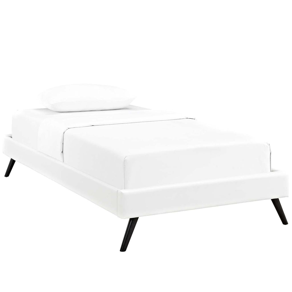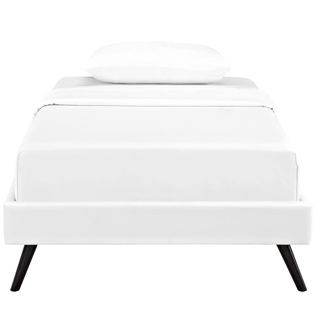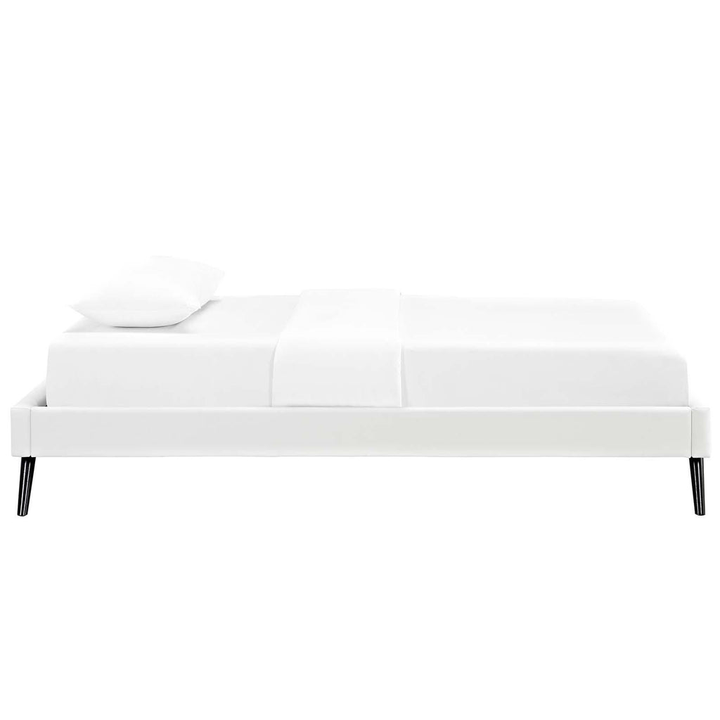 Accelerate your bedroom decor with the Loryn Platform Bed. Made with a solid wood frame upholstered in vinyl, Loryn features tapered wood legs, plastic foot glides, ten sturdy wood slats with a centered supporting bar and two support legs for enhanced stability. Due to the wooden slat support system, the use of a box spring is unnecessary. Loryn supports memory foam mattresses such as our Aveline series, and is compatible with one of our headboard styles: Jessamine, Terisa, Laura, Phoebe, Camille, and Josie. Perfect for mid-century modern, minimalist and contemporary bedrooms. Mattress not included.