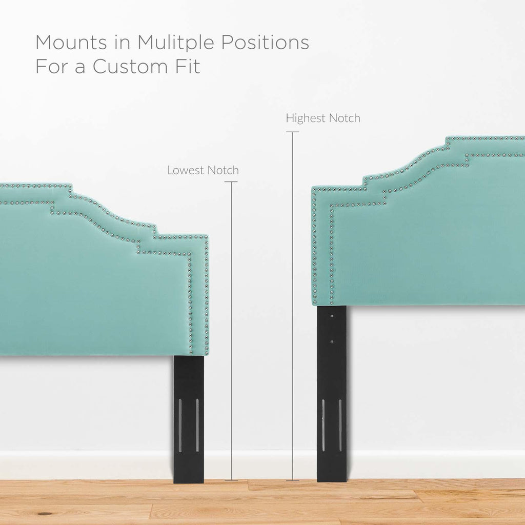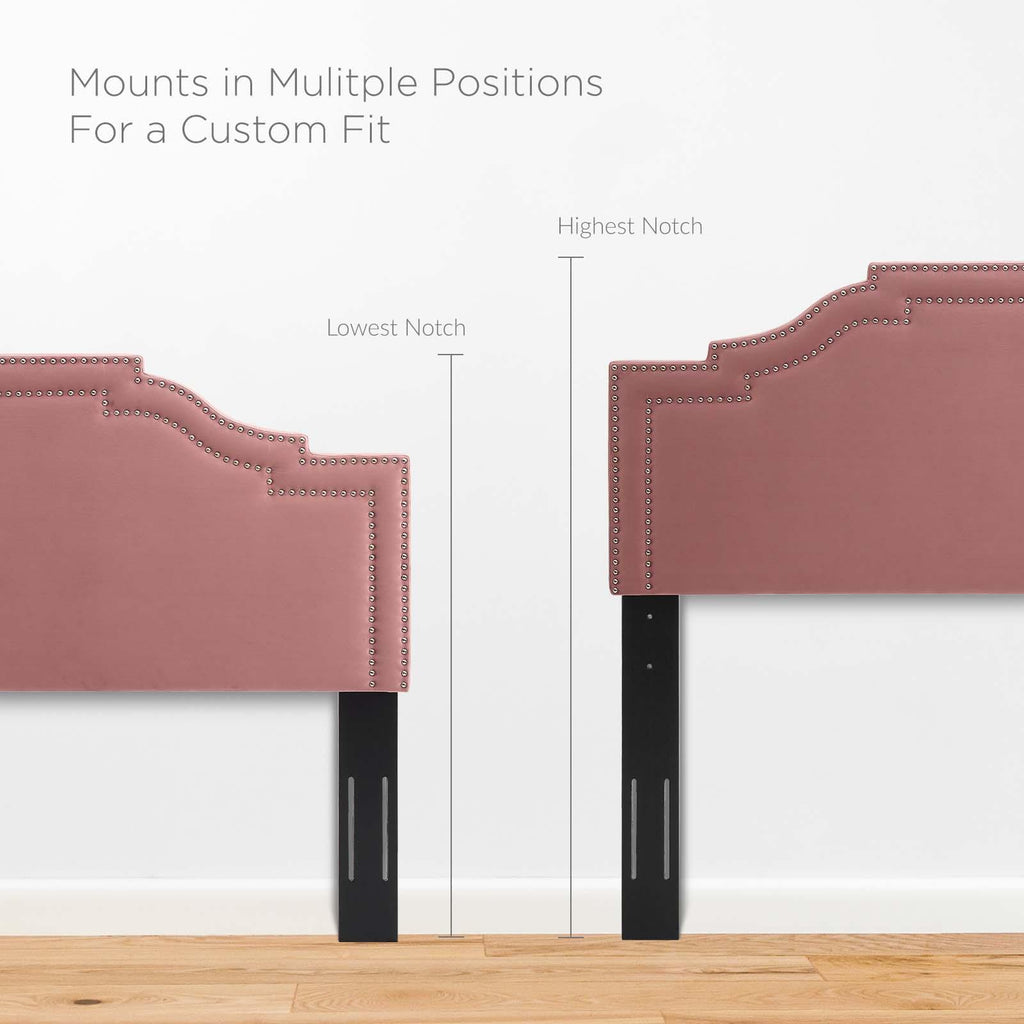 Influence glam deco style in a master bedroom or guest suite with the Lucia Performance Velvet King/California King Headboard. Featuring a double trim of nailheads and a unique arched shape, this velvet headboard brings tactile luxury to the bedroom. Covered in soft, stain-resistant performance velvet, this king/Cali king size headboard is padded in dense foam offering a supportive place to rest while sitting up in bed. A backdrop for a variety of bedding and sham styles, this height-adjustable headboard fits king or California king size bed frames with its three mounting positions. Assembly required.