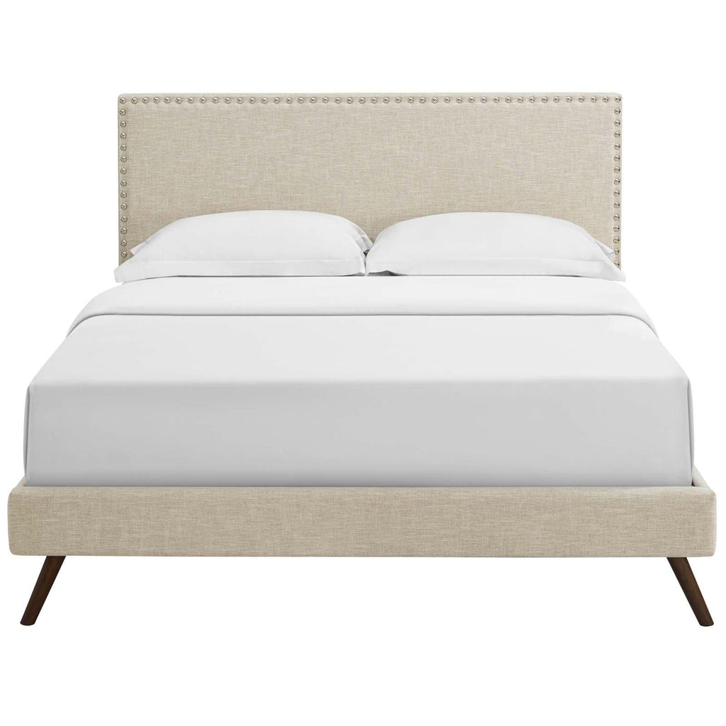 Accelerate your bedroom decor with the Macie Platform Bed. Made with a solid wood frame upholstered in polyester fabric, Macie features tapered wood legs, plastic foot glides, stylish headboard, and ten sturdy wood slats with a centered supporting bar and two support legs for enhanced stability. Due to the wooden slat support system, the use of a box spring is unnecessary. Macie supports memory foam mattresses such as our Aveline series. Perfect for mid-century modern, minimalist and contemporary bedrooms. Mattress not included. Assembly Required.