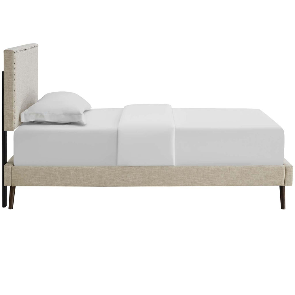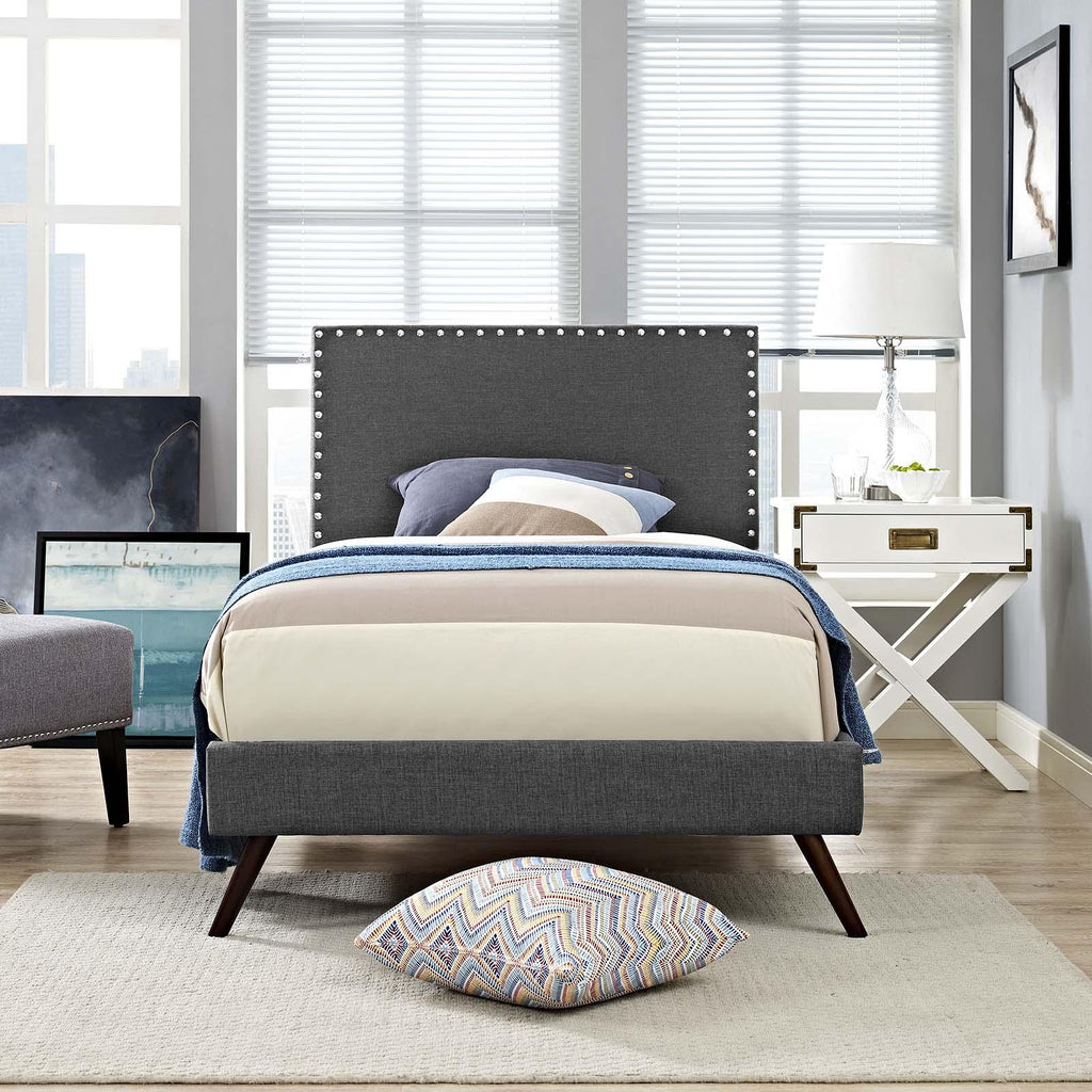 Accelerate your bedroom decor with the Macie Platform Bed. Made with a solid wood frame upholstered in polyester fabric, Macie features tapered wood legs, plastic foot glides, stylish headboard, and ten sturdy wood slats with a centered supporting bar and two support legs for enhanced stability. Due to the wooden slat support system, the use of a box spring is unnecessary. Macie supports memory foam mattresses such as our Aveline series. Perfect for mid-century modern, minimalist and contemporary bedrooms. Mattress not included. Assembly Required.