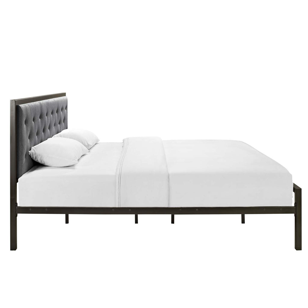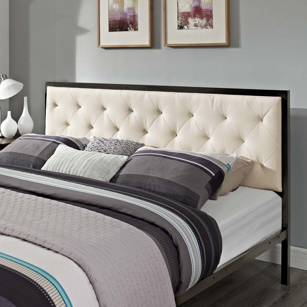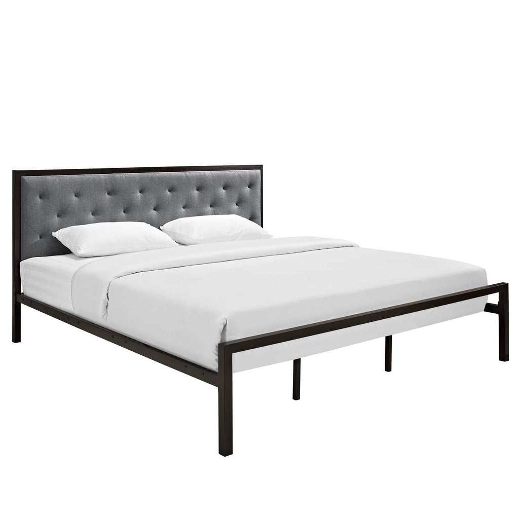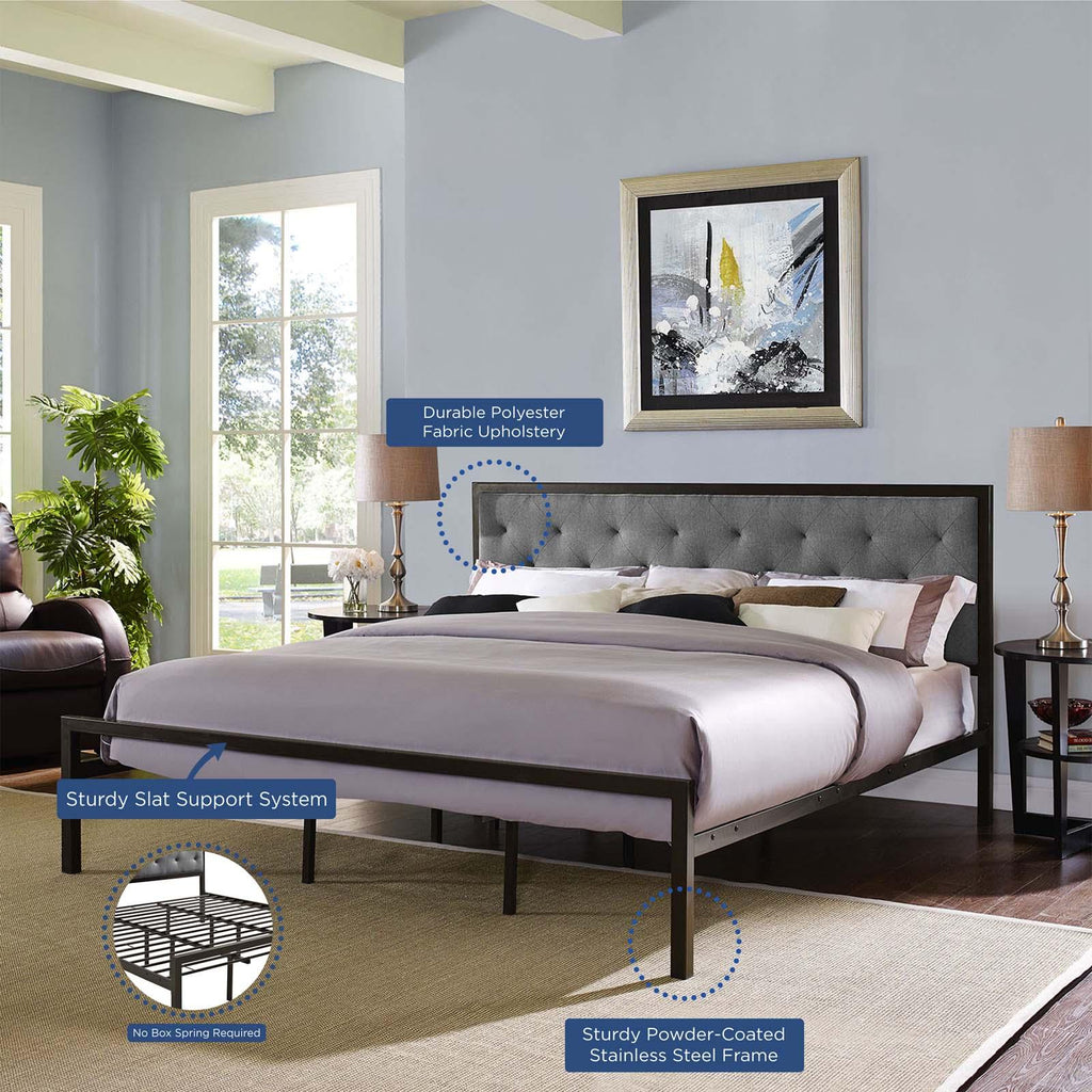 Sleep peacefully with a platform bed solid in both style and construction. Mia comes with a powder-coated steel frame that offers sturdy and long-lasting support, while the fabric headboard with deep tufted buttons adds a touch of magnificence to an otherwise minimalist design. The Mia Platform King Bed does not require a box spring. King mattress not included. Set Includes: One - Mia King Platform Bed Frame Platform bed frame with headboard Steel rod mattress support system Tufted button fabric headboard Powder-coated steel frame Does not require a box spring Assembly required Weight Capacity: 1200 Pounds Overall Product Dimensions: 84"L x 78.5"W x 43.5"H Headboard Dimensions: 3"L x 78.5"W x 43.5"H Footboard Dimensions: 1.5"L x 78.5"W x 17.5"H