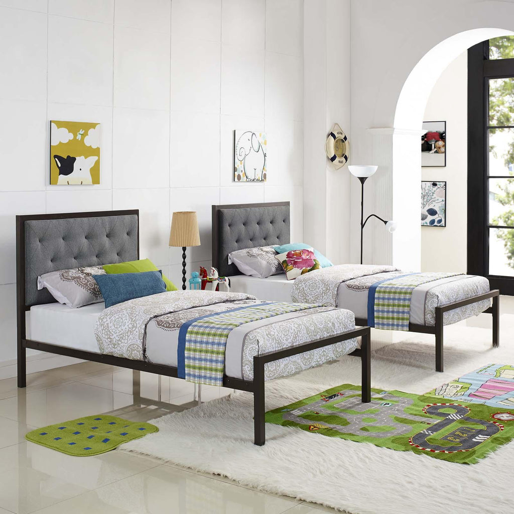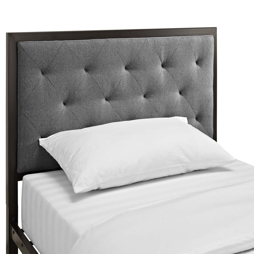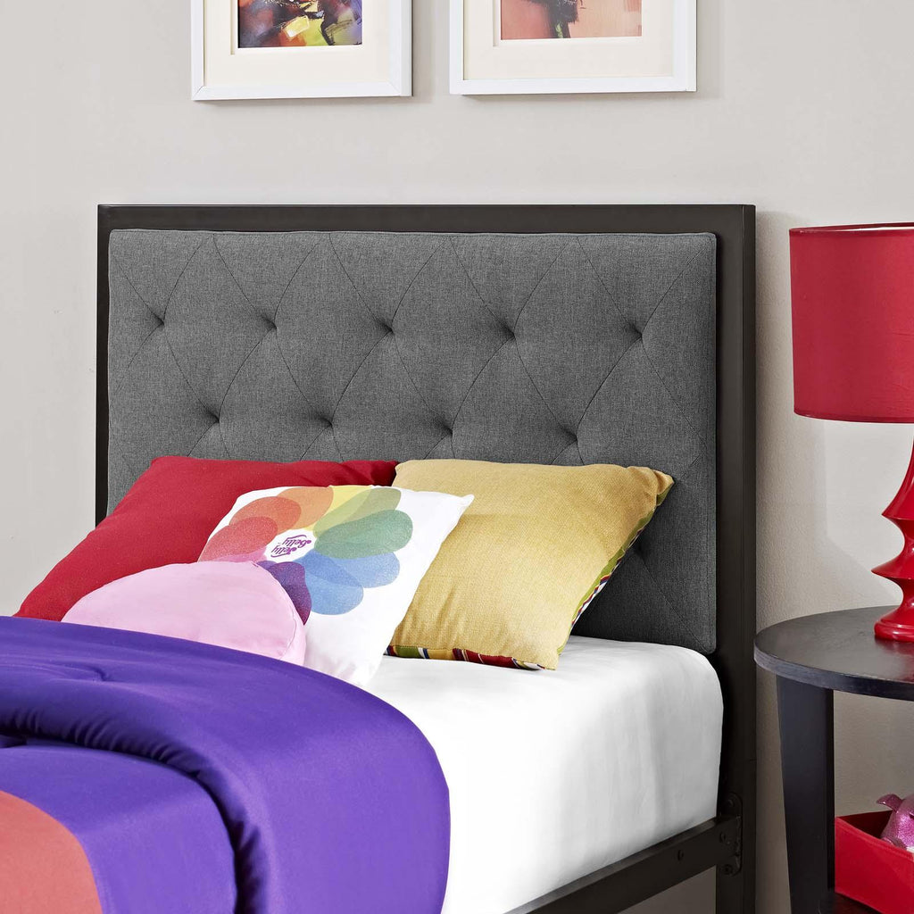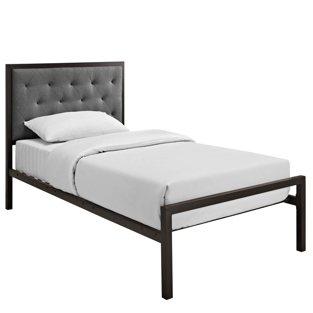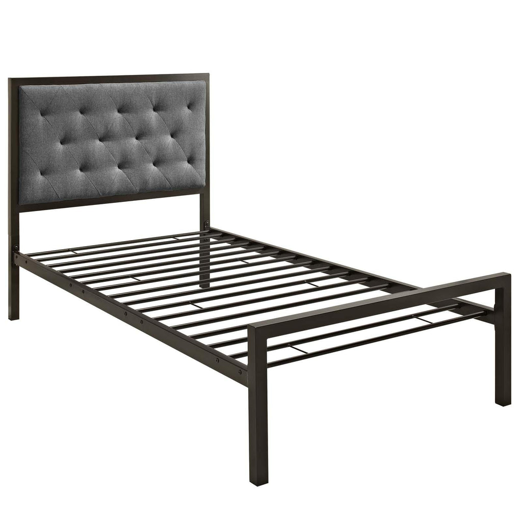 Sleep peacefully with a platform bed solid in both style and construction. Mia comes with a powder-coated steel frame that offers sturdy and long-lasting support, while the fabric headboard with deep tufted buttons adds a touch of magnificence to an otherwise minimalist design. The Mia Platform Twin Bed does not require a box spring. Twin mattress not included. Set Includes: One - Mia Twin Bed Frame Platform bed frame with headboard Steel rod mattress support system Tufted button fabric headboard Powder-coated steel frame Does not require a box spring Assembly required Overall Product Dimensions: 79"L x 41.5"W x 43.5"H Headboard Dimensions: 3.5"L x 41.5"W x 43.5"H Footboard Dimensions: 1.5"L x 41.5"W x 17.5"H Floor to Bottom of Headboard: 19"H Floor to Underside of Bed: 8.5"H