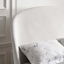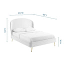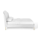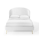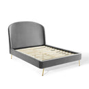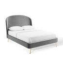 Embracing curves define the Mira Queen Performance Velvet Upholstered Platform Bed. An expansive sloping headboard on Mira will claim center stage in your bedroom decor with a glam deco style that radiates a bold new look. The Mira Queen Bed has dense foam padding that is covered in luxurious, stain-resistant performance velvet polyester upholstery for resting, reclining, reading, or conversing in bed. Four brushed gold stainless steel splayed legs with ball feet and non-marking foot caps support this queen bed solidly constructed from pine and plywood. Eliminating the need for a box spring, this platform bed frame is a sturdy mattress foundation for memory foam, innerspring, latex, and hybrid mattresses. Welcome the striking Mira Queen Bed into your master suite or guest bedroom for a decor transformation. Weight Capacity: 1323 lbs.