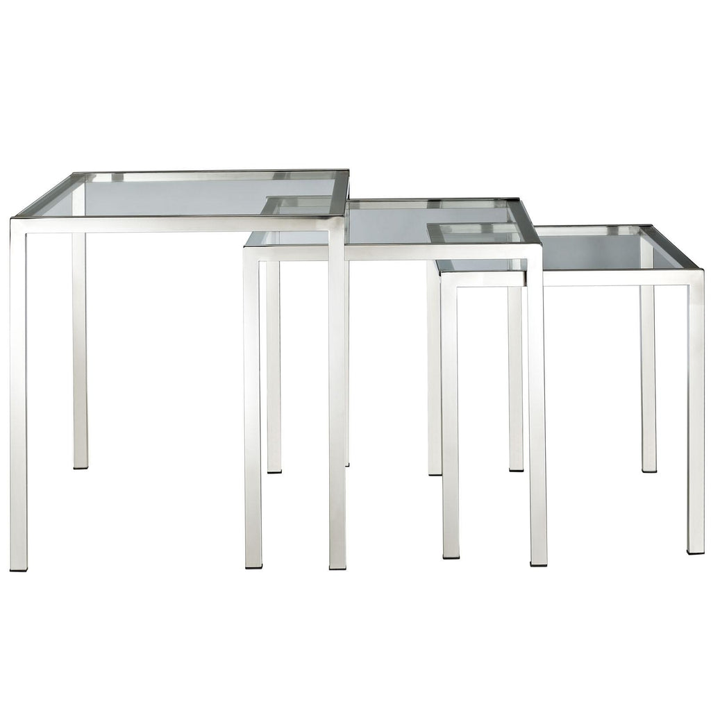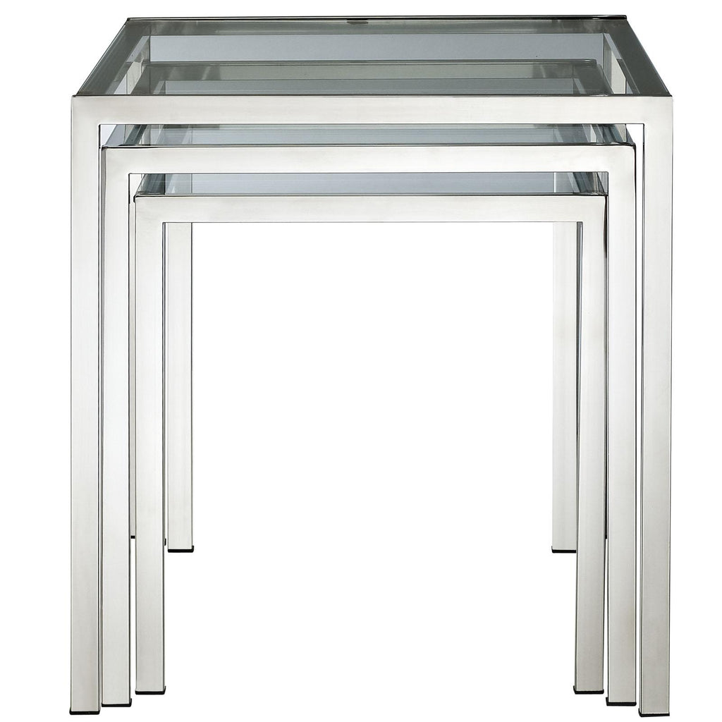 Energize your space in a quick three-stepped succession. The Nimble nesting table set is as minimalist and modern as it gets. The shimmering stainless steel frame blends well with any space, while the tempered glass top is resilient enough for many years of use. Set Includes: One - Large Nimble Stainless Steel Nesting Table One - Medium Nimble Stainless Steel Nesting Table One - Small Nimble Stainless Steel Nesting Table Modern 3 Piece Nesting Table Set Stainless Steel Frame Tempered Glass Top Overall Product Dimensions: 20"L x 20.5"W x 21.5"H Large Table Dimensions: 20"L x 20.5"W x 21.5"H Medium Table Dimensions: 18"L x 18.5"W x 19.5"H Small Table Dimensions: 16"L x 16.5"W x 17.5"H