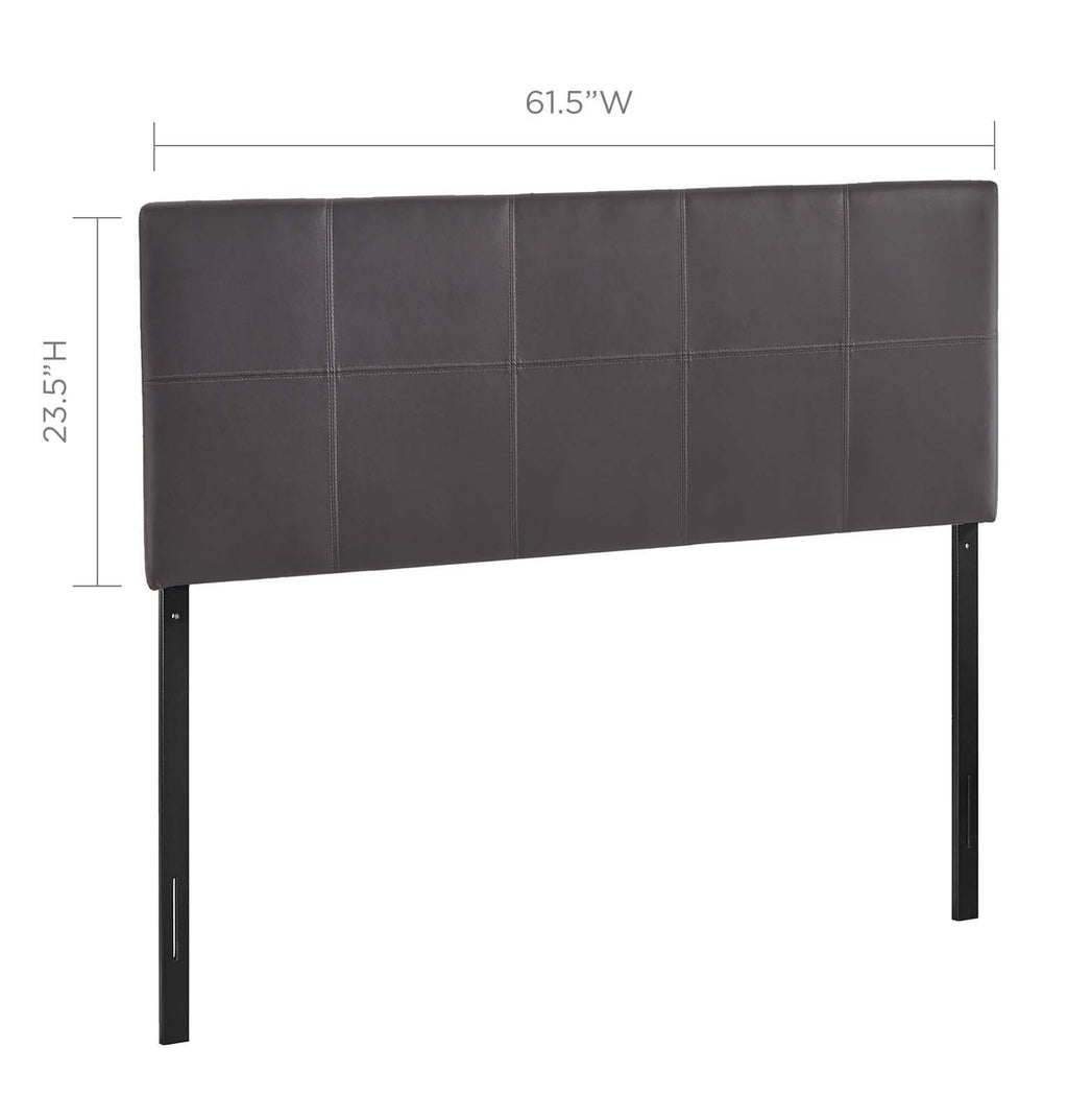The generously padded Modway Oliver Upholstered Faux Leather Queen Headboard conveys a sense of positive resolve while imparting a taste decor flair that never fades. Outfitted with raised trim and an effervescent sheen, Oliver Queen Headboard embellishes your d�cor without detracting from the finer elements of style. Set Includes: One - Oliver Headboard Contemporary queen-sized headboard Headboard only Wipe clean with a slightly damp cloth Assembly required Overall Product Dimensions: 3"L x 61.5"W x 53"H Bedframe Mounting Location: 4.5 - 8.5"H Mounting Location A - Height to Top of Headboard: 53"H Mounting Location A - Height to Bottom of Headboard: 30.5"H Mounting Location B - Height to Top of Headboard: 50.5"H Mounting Location B - Height to Bottom of Headboard: 28"H Mounting Location C - Height to Top of Headboard: 48"H Mounting Location C - Height to Bottom of Headboard: 25.5"H Mounting Location D - Height to Top of Headboard: 45.5"H Mounting Location D - Height to Bottom of Headboard: 23"H