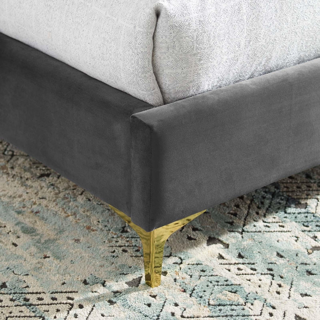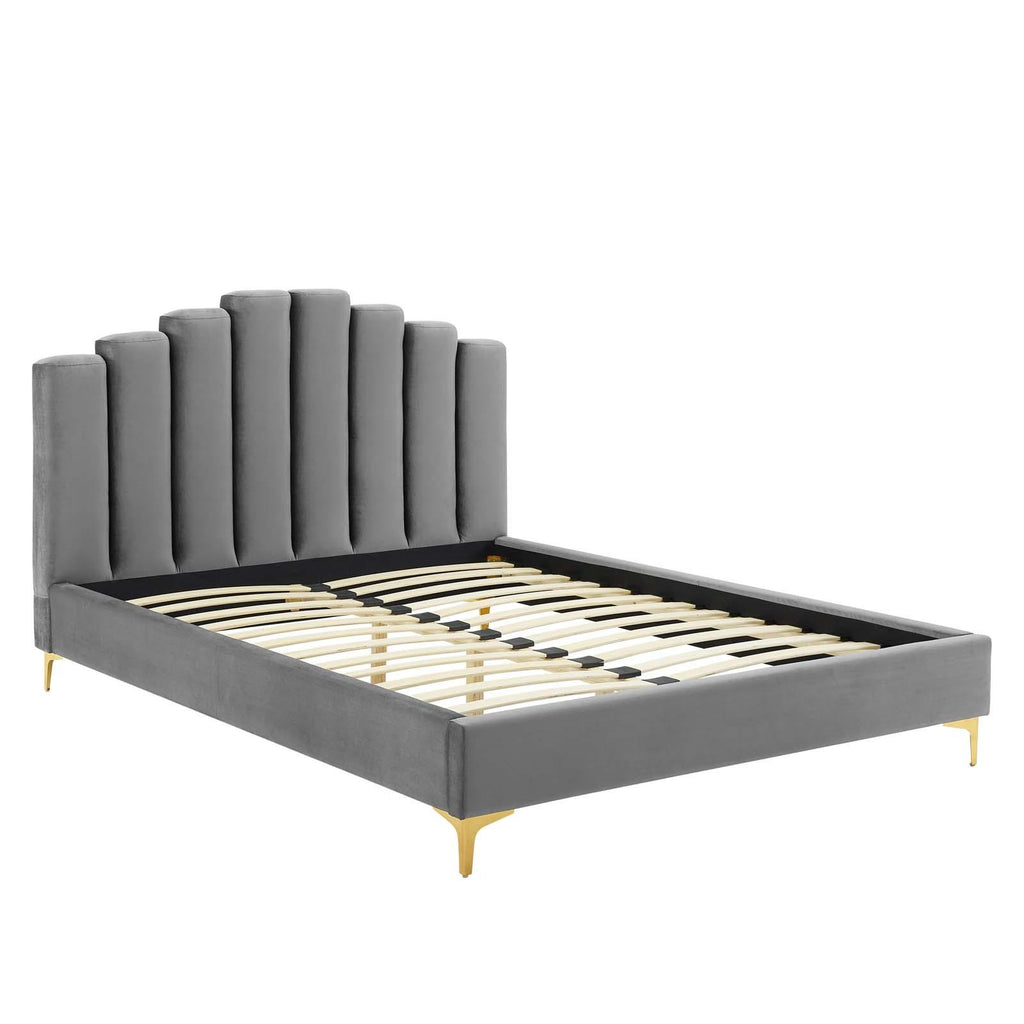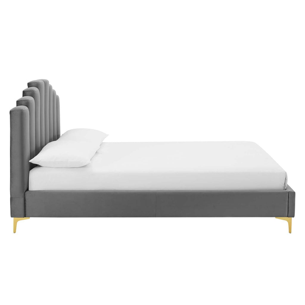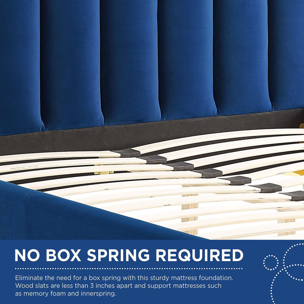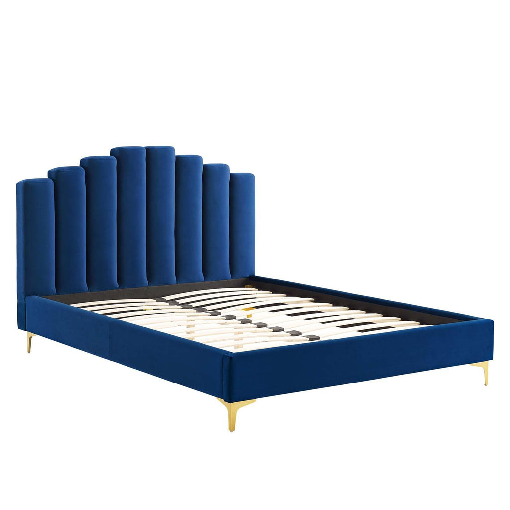 Instill luxurious style and comfortable sleep in a master suite or guest bedroom with the Olivia Performance Velvet Queen Platform Bed. Abounding in glam deco style and vintage charm, the upholstered headboard of this queen bed features a modern twist on classic channel tufting with velvety panels ascending upwards in an arching design. The padded queen headboard and side rails come upholstered in soft, stain-resistant performance velvet upholstery that grants rich texture to the elegant form. Resting atop gold metal legs with non-marking caps, this platform bed frame is a sturdy mattress foundation with a wood slat support system that eliminates the need for a box spring and promotes healthy air circulation for memory foam, latex, innerspring, and hybrid mattresses. Assembly Required. Bed Weight Capacity: 800 lbs. Set Includes: One - Olivia Queen Platform Bed Queen Platform Bed Wood Slat Support System with Center Beam Performance Velvet Polyester Upholstery Durable Stain-Resistant Fabric Gold Metal Legs With Non-Marking Caps Assembly Required Bed Weight Capacity: 800 lbs. Overall Product Dimensions: 94.5"L x 66"W x 47"H Headboard Dimensions: 6"L x 66"W x 47"H Footboard Dimensions: 6"L x 66"W x 8"H Side Rail Dimensions: 81.5"L x 65.5"W x 8"H Side Rail Thickness: 2.5"H