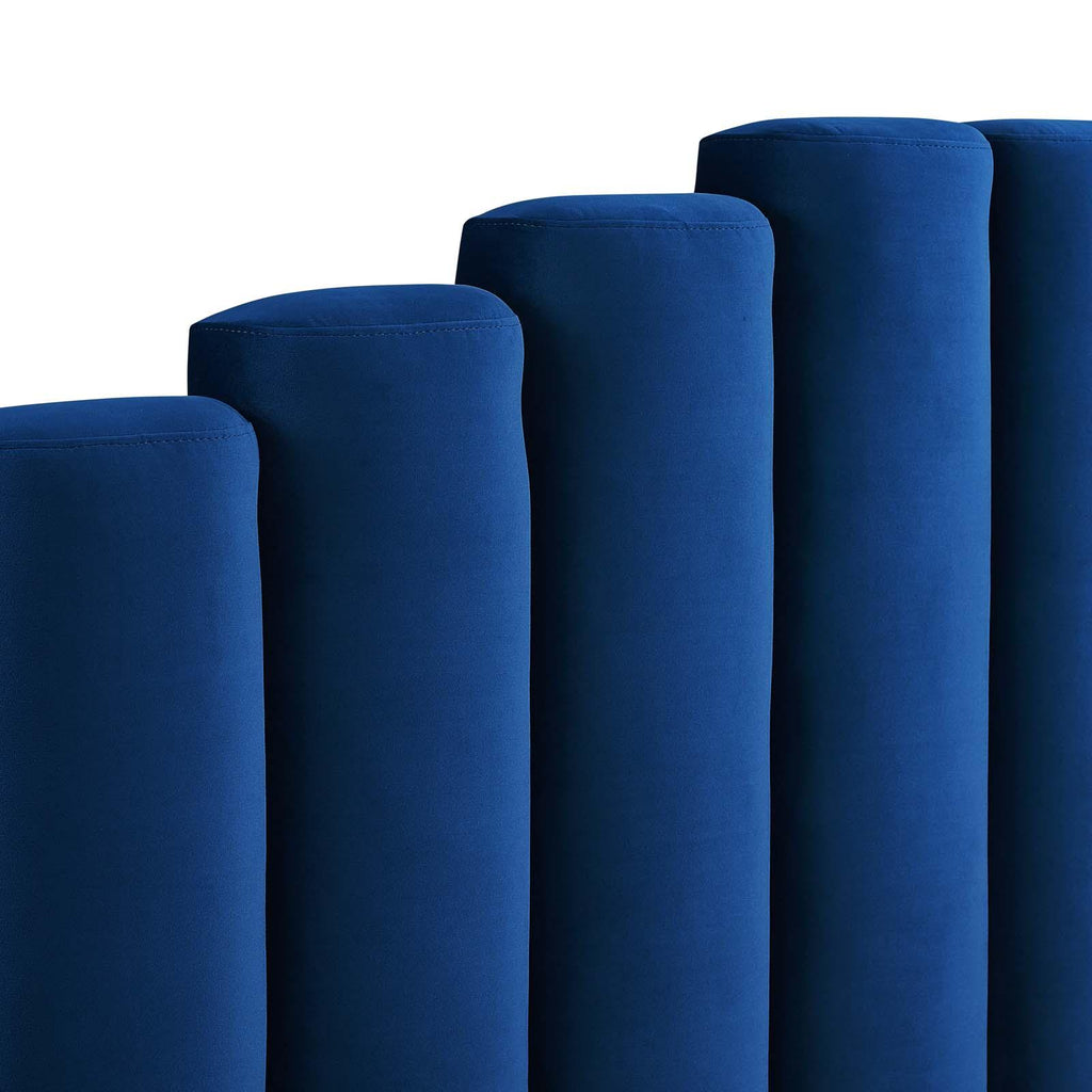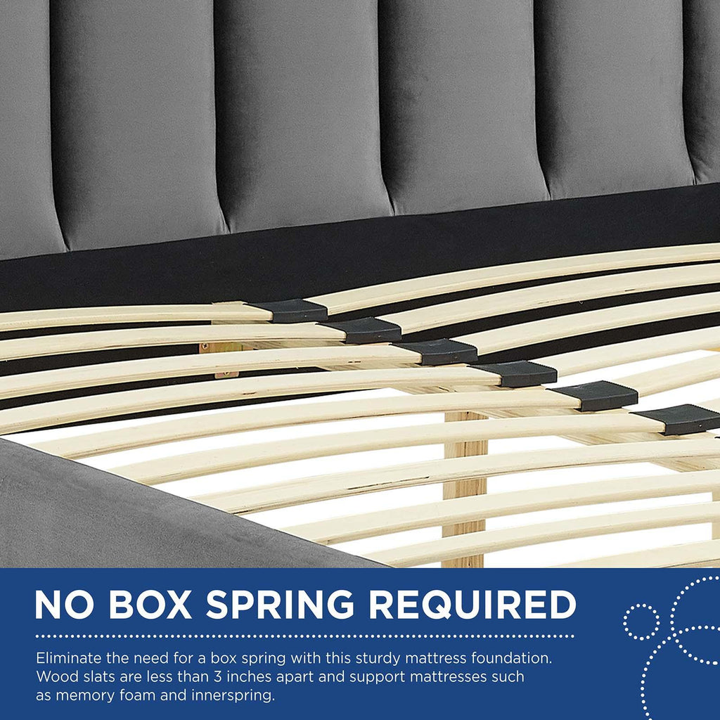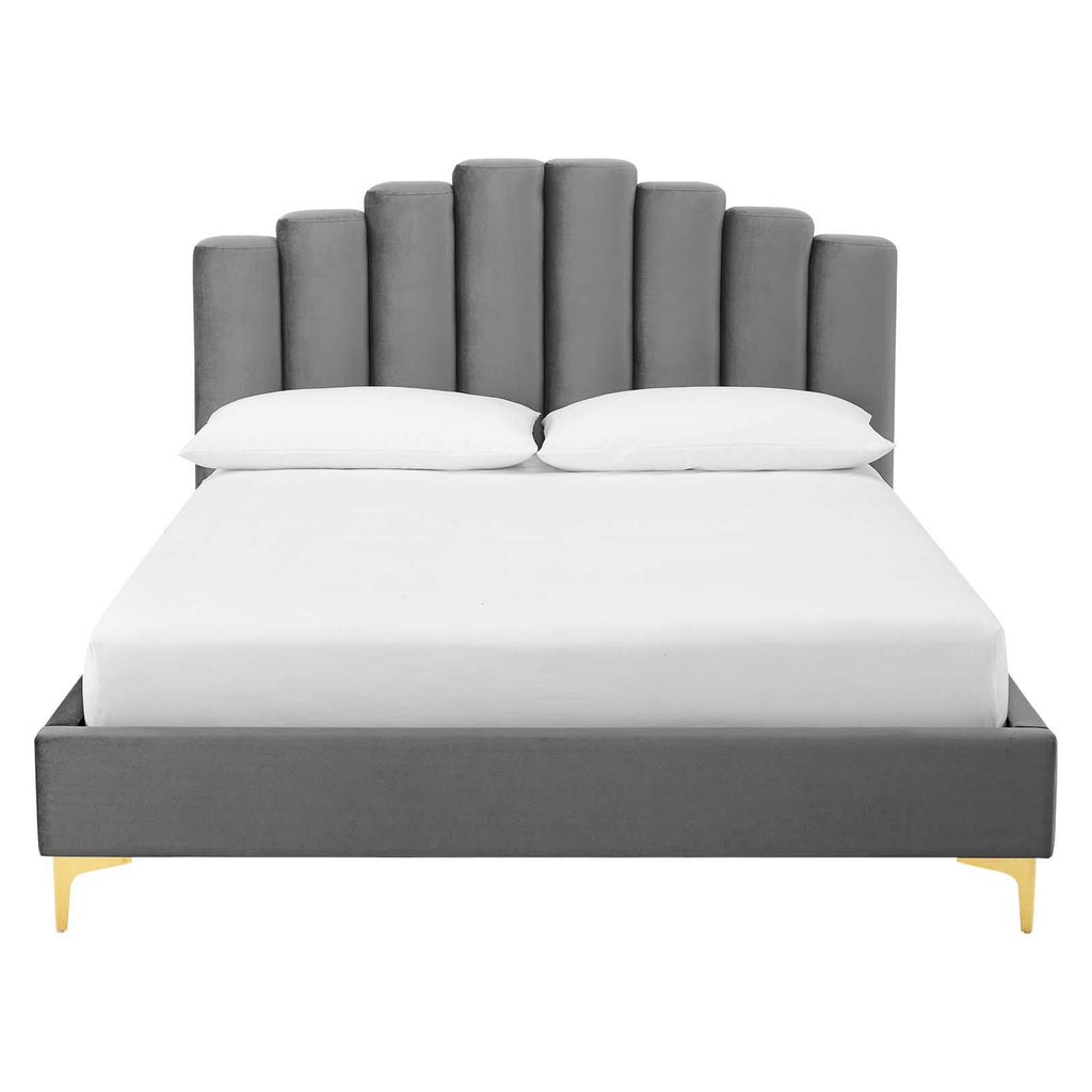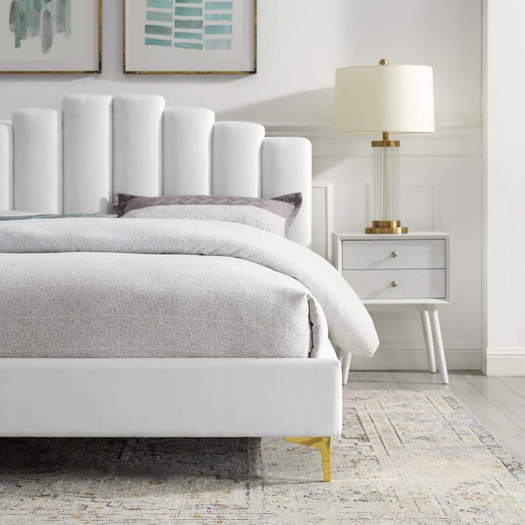 Instill luxurious style and comfortable sleep in a master suite or guest bedroom with the Olivia Performance Velvet Queen Platform Bed. Abounding in glam deco style and vintage charm, the upholstered headboard of this queen bed features a modern twist on classic channel tufting with velvety panels ascending upwards in an arching design. The padded queen headboard and side rails come upholstered in soft, stain-resistant performance velvet upholstery that grants rich texture to the elegant form. Resting atop gold metal legs with non-marking caps, this platform bed frame is a sturdy mattress foundation with a wood slat support system that eliminates the need for a box spring and promotes healthy air circulation for memory foam, latex, innerspring, and hybrid mattresses. Assembly Required. Bed Weight Capacity: 800 lbs. Set Includes: One - Olivia Queen Platform Bed Queen Platform Bed Wood Slat Support System with Center Beam Performance Velvet Polyester Upholstery Durable Stain-Resistant Fabric Gold Metal Legs With Non-Marking Caps Assembly Required Bed Weight Capacity: 800 lbs. Overall Product Dimensions: 94.5"L x 66"W x 47"H Headboard Dimensions: 6"L x 66"W x 47"H Footboard Dimensions: 6"L x 66"W x 8"H Side Rail Dimensions: 81.5"L x 65.5"W x 8"H Side Rail Thickness: 2.5"H