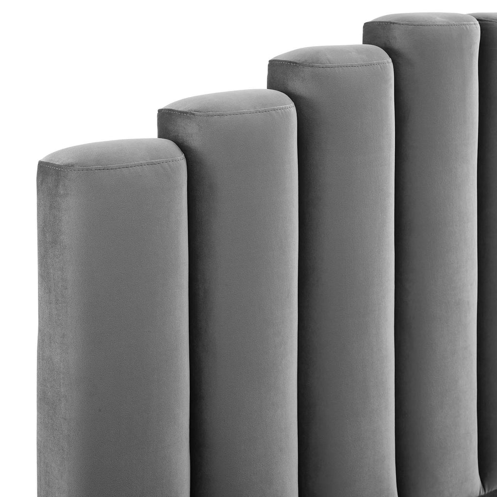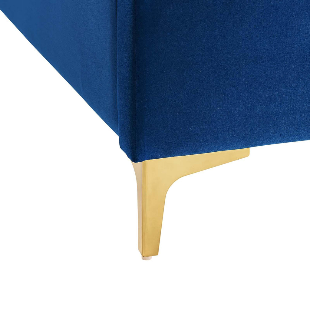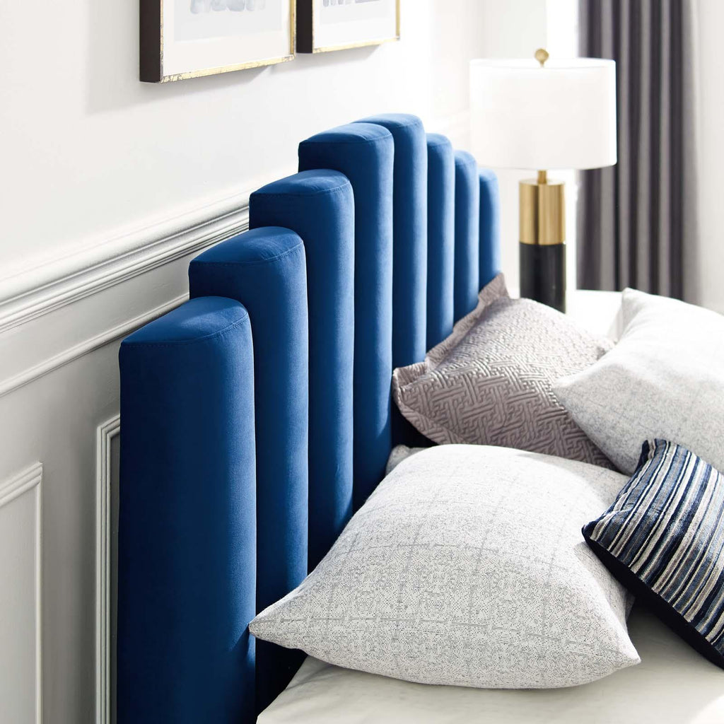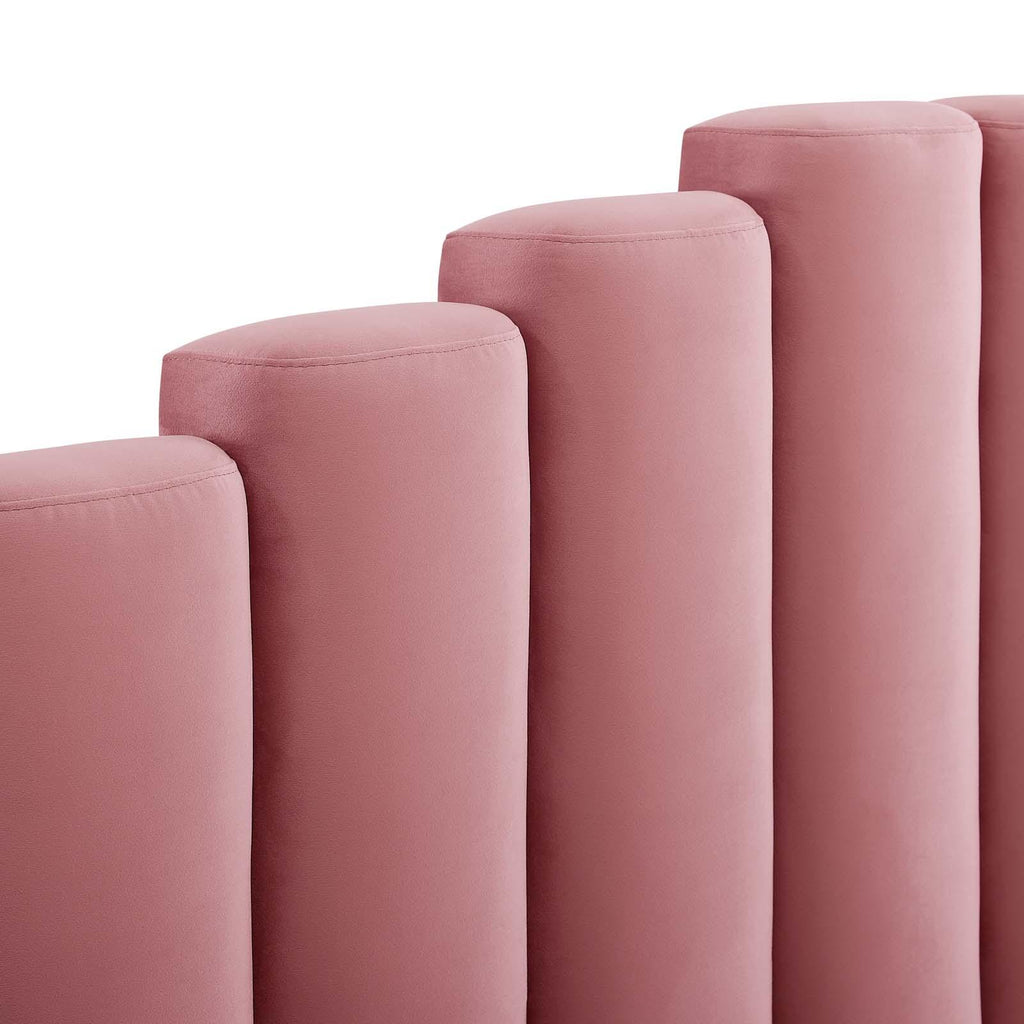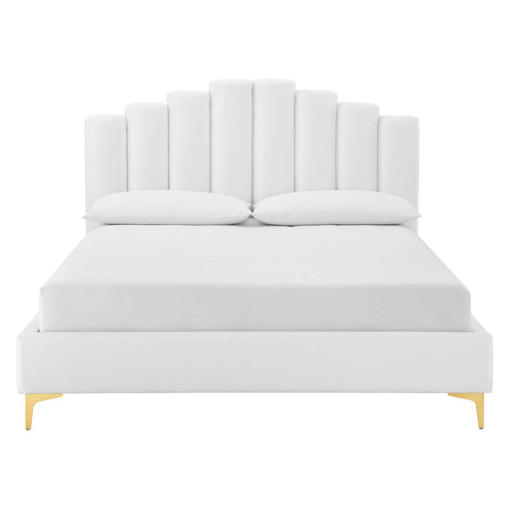 Instill luxurious style and comfortable sleep in a master suite or guest bedroom with the Olivia Performance Velvet Queen Platform Bed. Abounding in glam deco style and vintage charm, the upholstered headboard of this queen bed features a modern twist on classic channel tufting with velvety panels ascending upwards in an arching design. The padded queen headboard and side rails come upholstered in soft, stain-resistant performance velvet upholstery that grants rich texture to the elegant form. Resting atop gold metal legs with non-marking caps, this platform bed frame is a sturdy mattress foundation with a wood slat support system that eliminates the need for a box spring and promotes healthy air circulation for memory foam, latex, innerspring, and hybrid mattresses. Assembly Required. Bed Weight Capacity: 800 lbs. Set Includes: One - Olivia Queen Platform Bed Queen Platform Bed Wood Slat Support System with Center Beam Performance Velvet Polyester Upholstery Durable Stain-Resistant Fabric Gold Metal Legs With Non-Marking Caps Assembly Required Bed Weight Capacity: 800 lbs. Overall Product Dimensions: 94.5"L x 66"W x 47"H Headboard Dimensions: 6"L x 66"W x 47"H Footboard Dimensions: 6"L x 66"W x 8"H Side Rail Dimensions: 81.5"L x 65.5"W x 8"H Side Rail Thickness: 2.5"H
