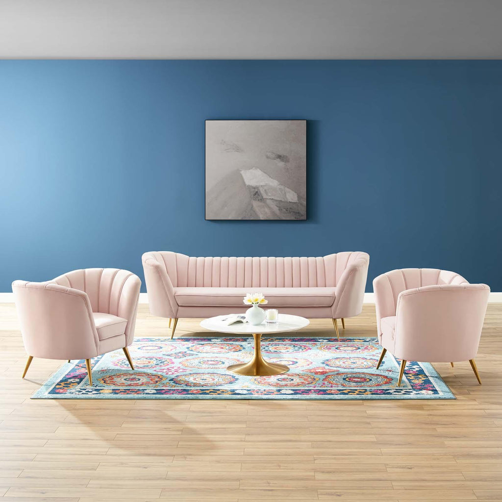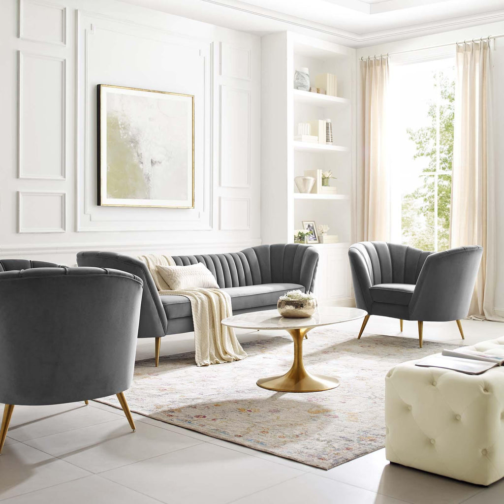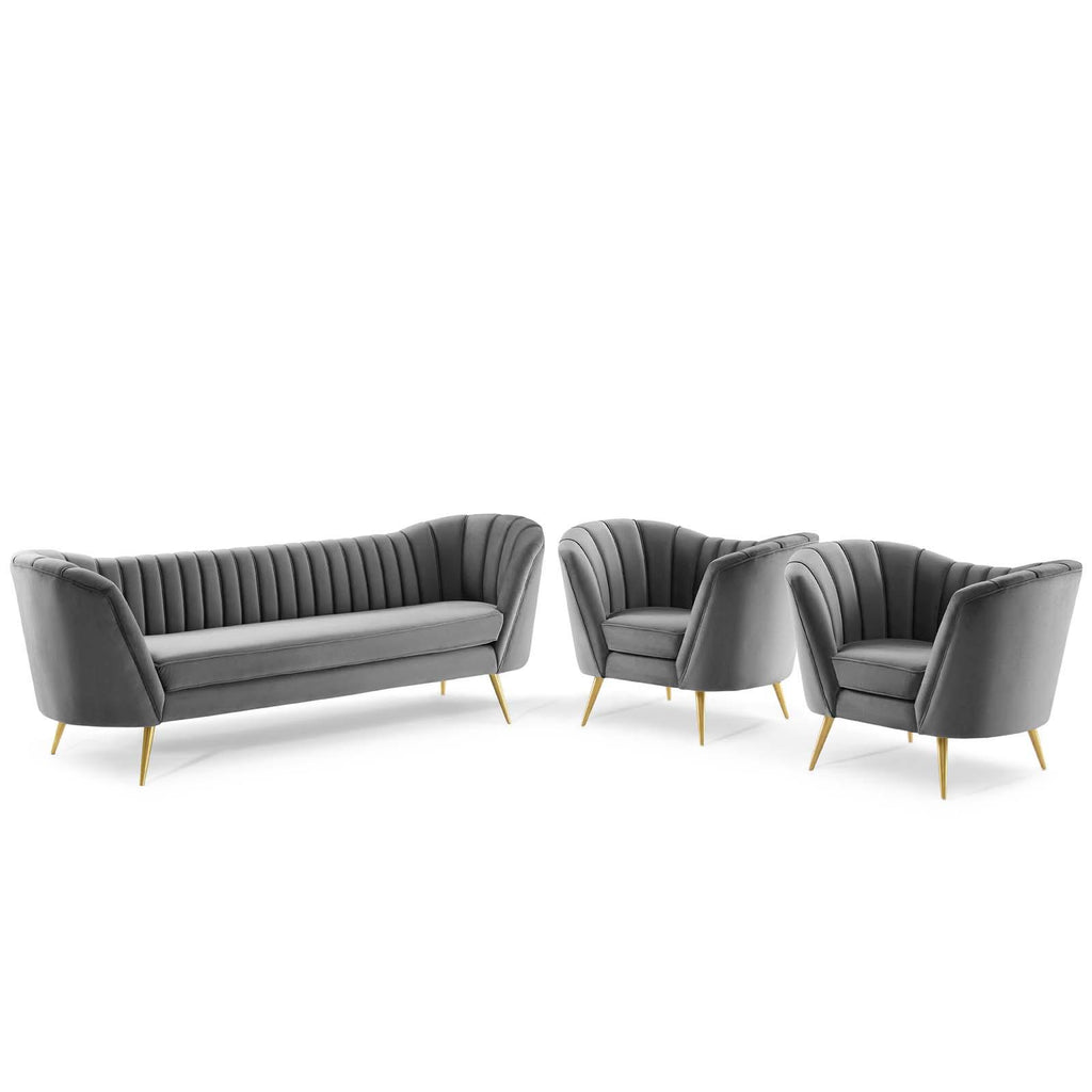Introduce vintage glamour with the Opportunity Performance Velvet Sofa and 2 Armchair Set. Featuring a scalloped silhouette and elegantly curved back, Opportunity delivers a luxurious seating experience with soft, stain-resistant performance velvet upholstery, an individually wrapped pocket coil system, and dense foam padding. Complete with a removable seat cushion with a removable cover, Opportunity features interior vertical channel tufting along the interior with this comfortable retro-modern set for your living room or lounge room. Sofa Weight Capacity: 900 lbs Armchair Weight Capactiy: 300 lbs Set Includes: One - Opportunity Vertical Channel Tufted Curved Sofa Two - Opportunity Armchair Dense Foam Padding Durable Stain-Resistant Fabric Gold Stainless Steel Legs Vertical Channel Tufting Individually-Wrapped Pocket Coils Assembly Required "Sofa Weight Capacity: 900 lbs, Armchair Weight Capacity: 300 lbs" Overall Product Dimensions: 117.5"L x 118"W x 32"H Sofa Dimensions: 29.5"L x 88.5"W x 32"H Armchair Dimensions: 29.5"L x 44"W x 32"H