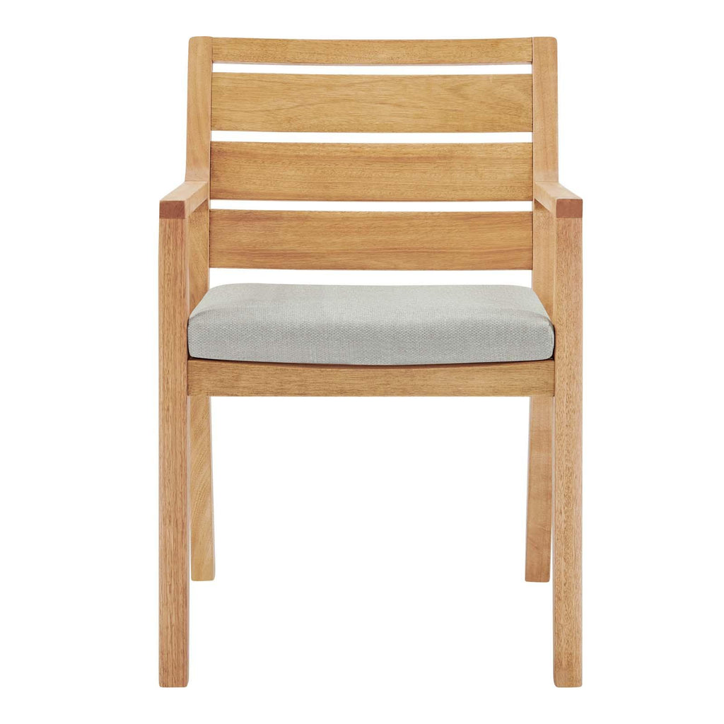 Recreate the coziness of indoor dining in your outdoor decor with Portsmouth Outdoor Patio Wood Armchair. Solidly constructed from FSC certified karri wood, the slatted back, seat, and sleek organic design produce an innate beauty that will draw the attention of friends and family. A removable all-weather cushion allows for easy-to-clean usage of this outdoor patio chair. Portsmouth has four sturdy tapered legs with comfortable support for any gathering in your backyard, patio, porch, or deck. Introduce the Portsmouth Patio Dining Armchair to your space and allow the modern farmhouse charm to transform your patio furniture decor. Chair Weight Capacity: 331 lbs.