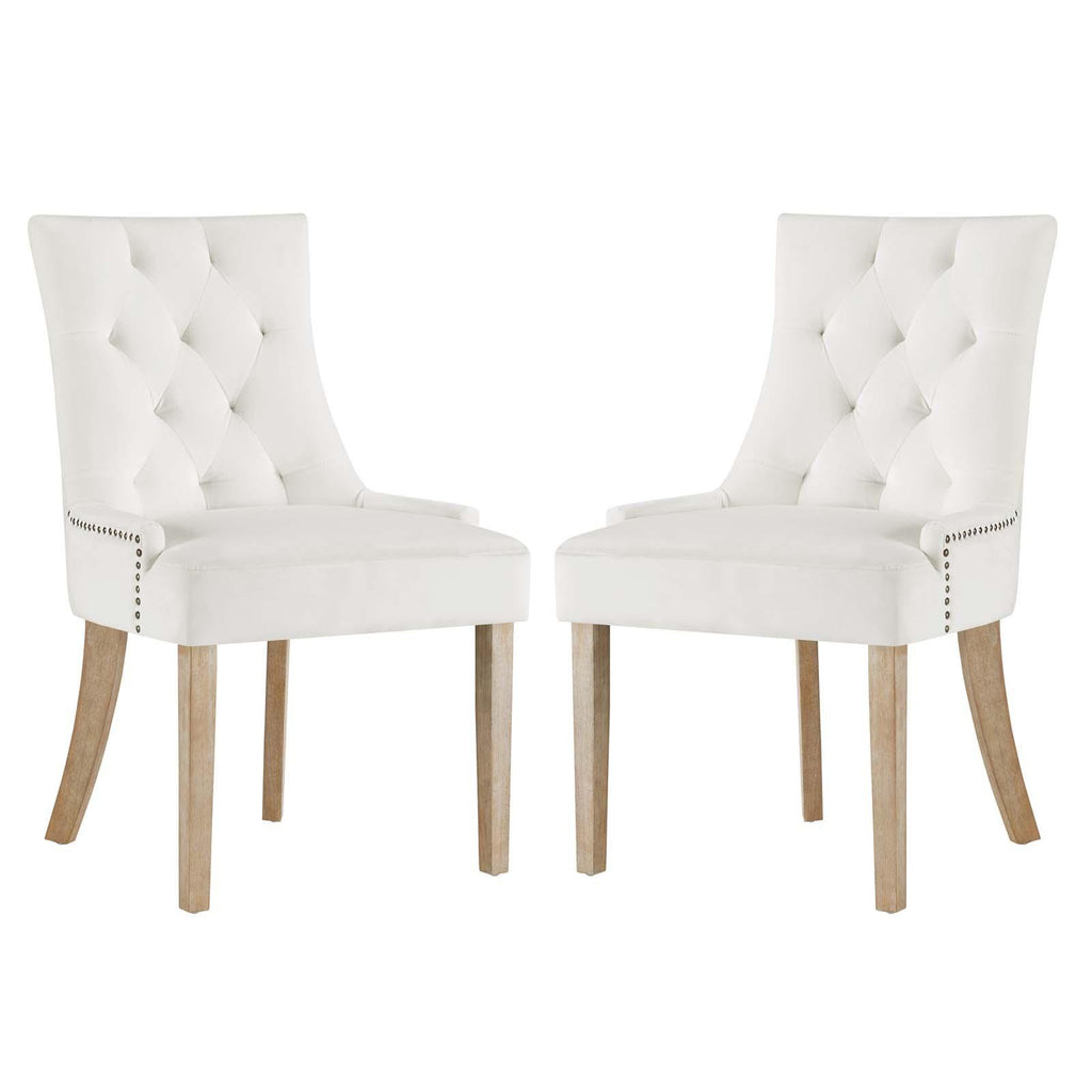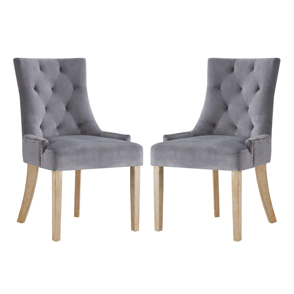 Update your dining room d�cor with the Pose Performance Velvet Dining Chair Set. Designed with a charming modern farmhouse aesthetic, Pose features elegant tufting, exquisite nailhead trim, padded seat and back with soft, stain-resistant performance velvet upholstery, and a d�corative metal ring on the chair back for a delightful finishing touch. Supported by solid natural wood legs with flared back legs and non-marking foot caps, Pose is a distinctive dining chair perfect for the modern home. Set Includes: Two - Pose Dining Chair Modern Accent Chair Performance Velvet Upholstery Natural Wood Legs Studded Nailhead Trim Dense Foam Padding for Comfort Non-Marking Foot Caps Assembly Required Overall Product Dimensions: 24.5"L x 21.5"W x 36"H Overall Dining Chair Dimensions: 24.5"L x 21.5"W x 36"H Seat Dimensions: 17"L x 21.5"W x 19"H Backrest Dimensions: 18"W x 17"H Armrest Height: 20"H