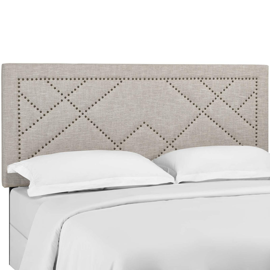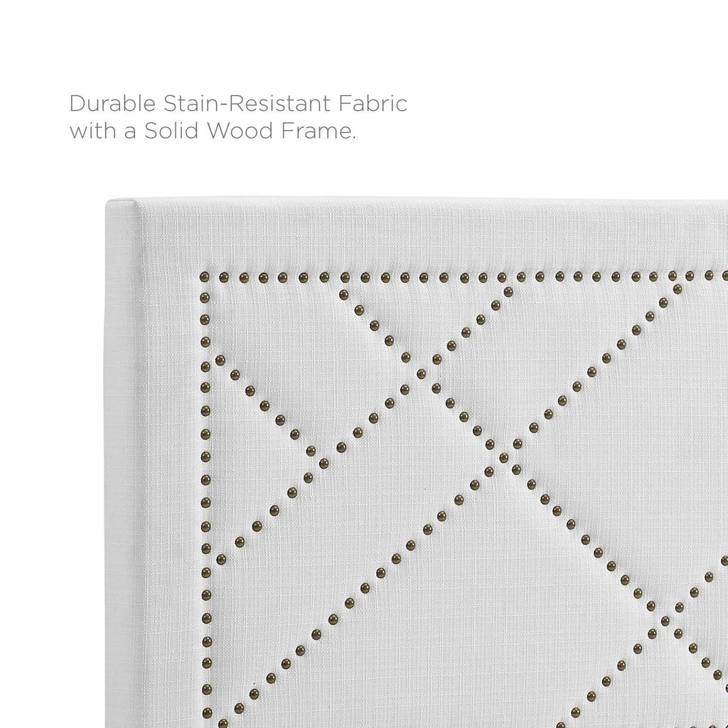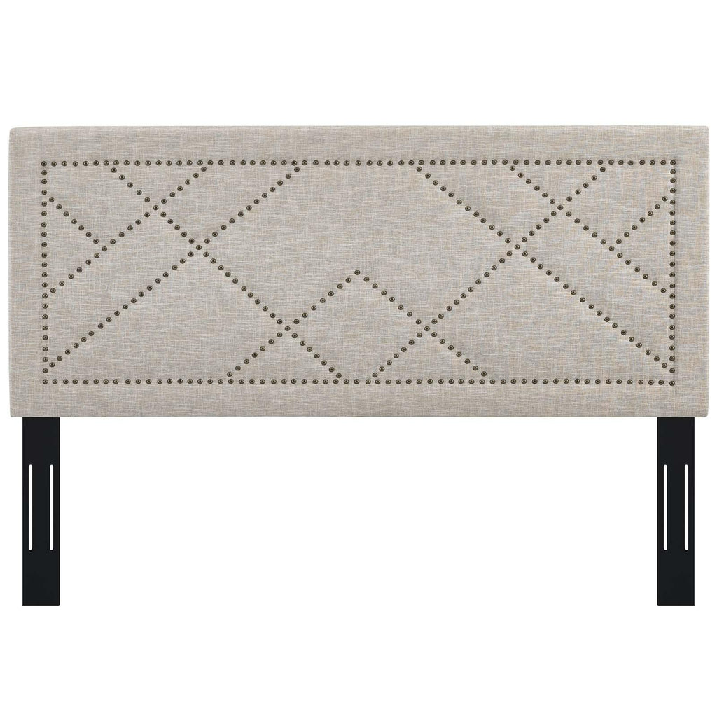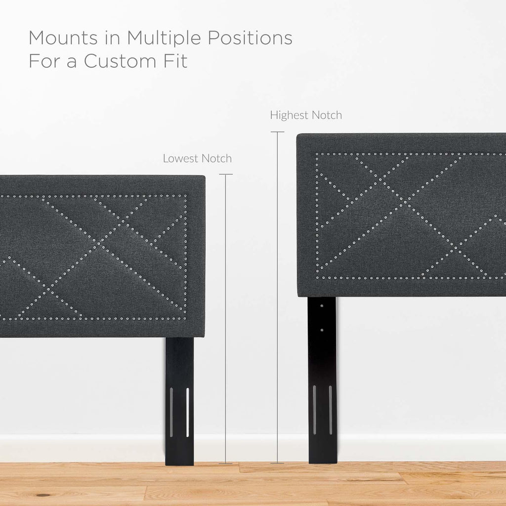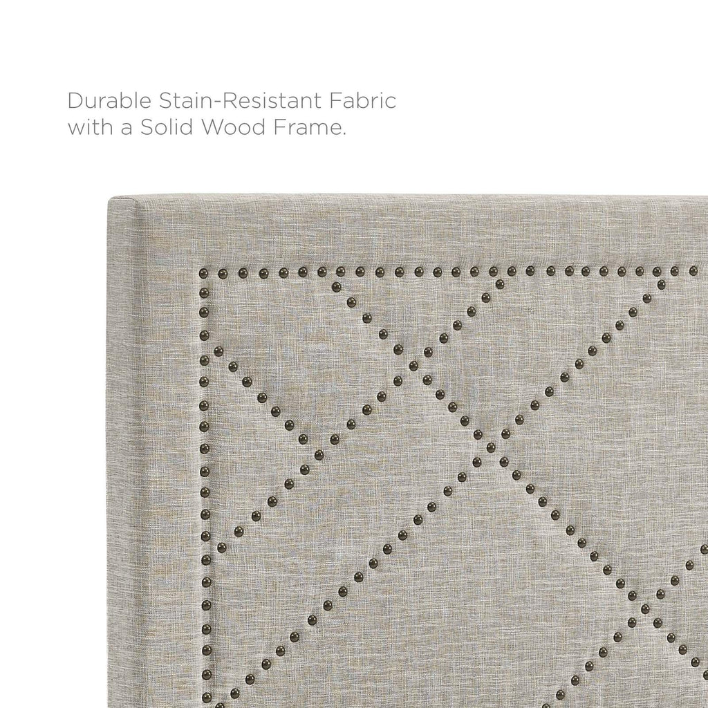 Experience the geometric subtlety of Reese. Featuring an intersecting metal nailhead pattern and inset rim, Reese graces the modern guest bedroom or master suite with a king or Cali / California king headboard that makes a striking decor statement. Made of soft upholstered linen fabric covering a durable fiberboard and plywood frame, Reese comes solidly constructed with extra wide black-stained wood post legs that fit either king or California king bed frames, and are height adjustable in three mounting positions. This tall headboard ranges from 46 - 54 inches in height, making this dense foam padded headboard a luxurious addition for quality support while reading and relaxing.