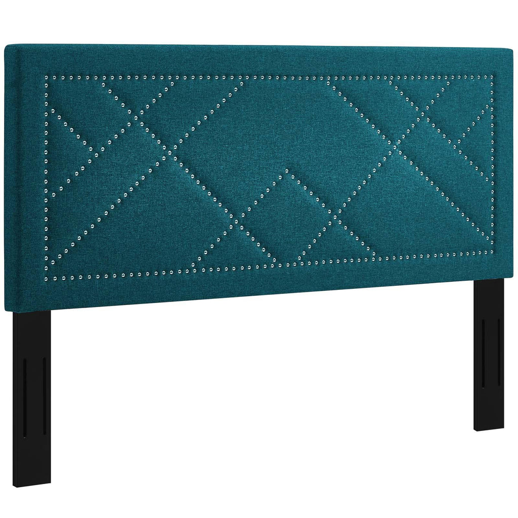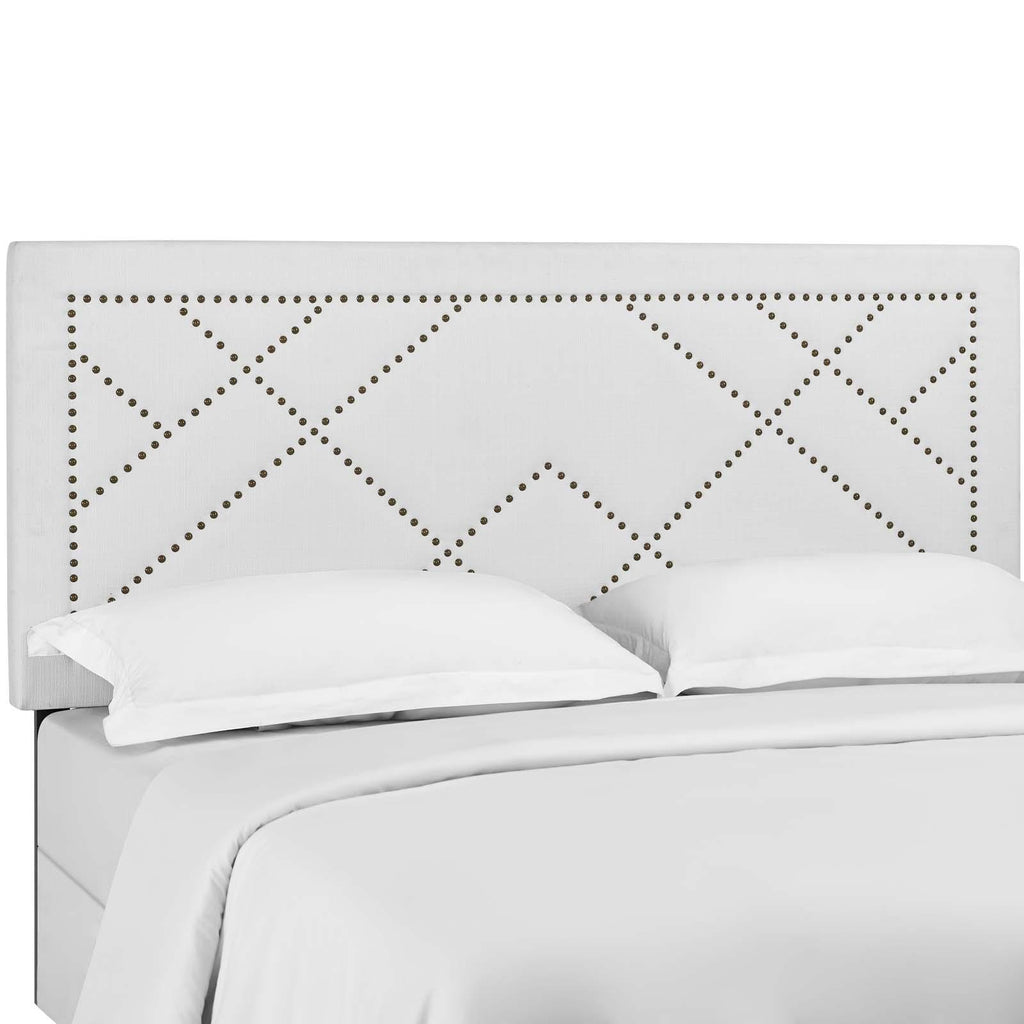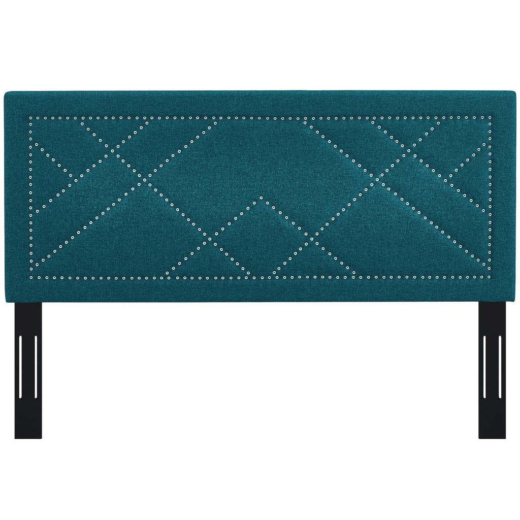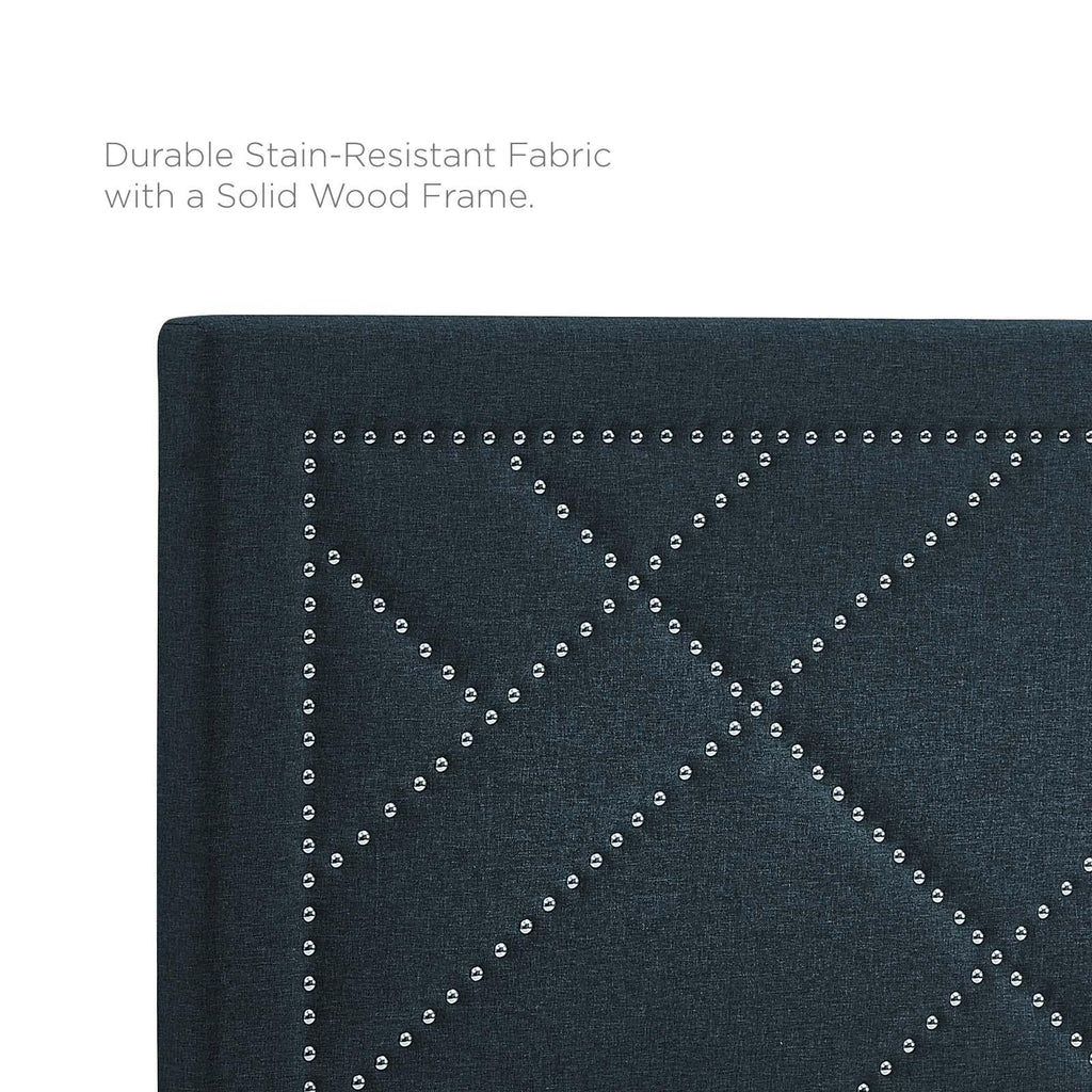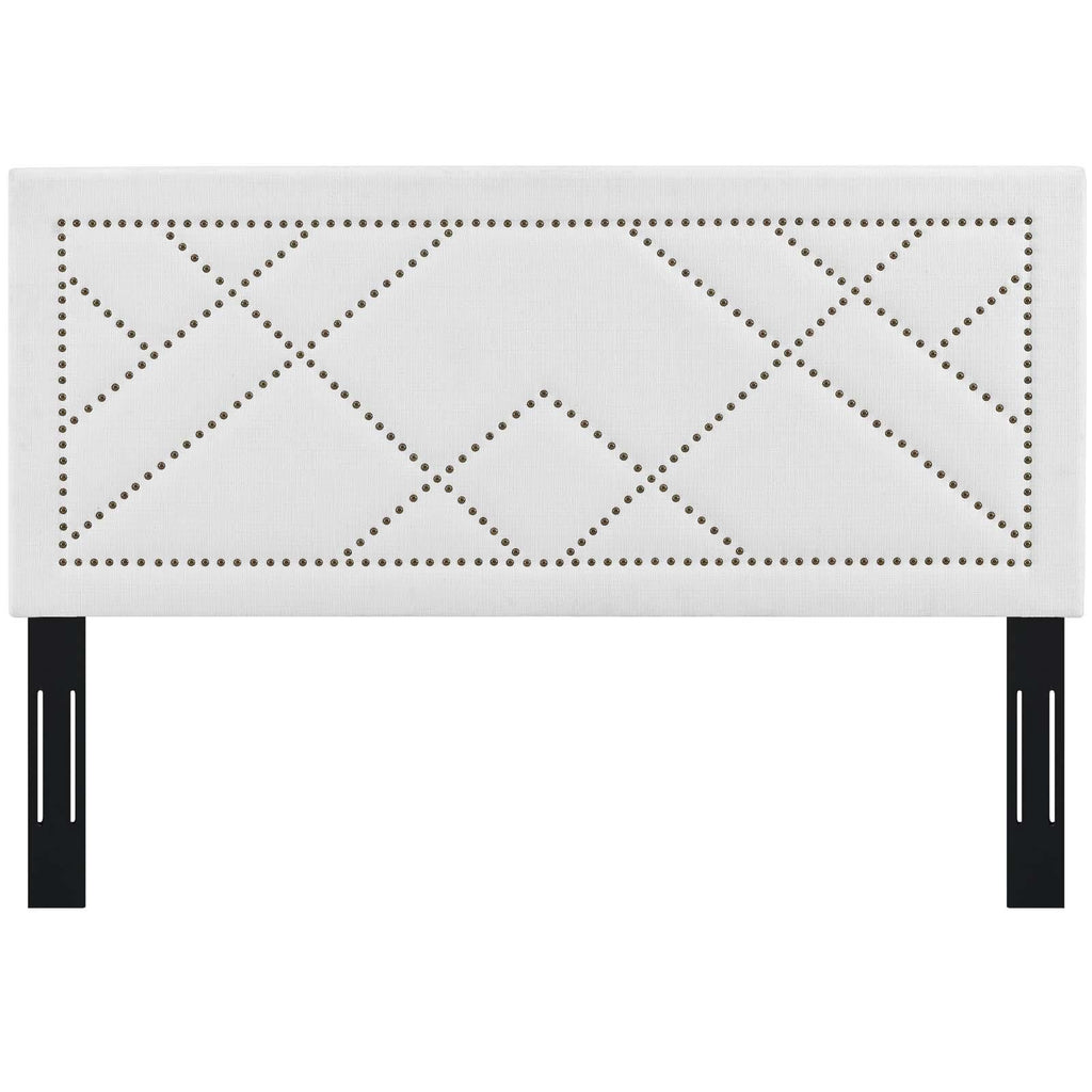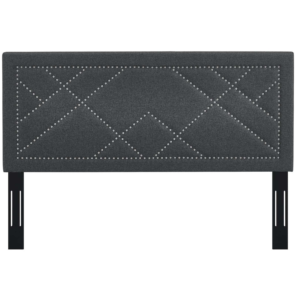 Experience the geometric subtlety of Reese. Featuring an intersecting metal nailhead pattern and inset rim, Reese graces the modern guest bedroom or master suite with a king or Cali / California king headboard that makes a striking decor statement. Made of soft upholstered linen fabric covering a durable fiberboard and plywood frame, Reese comes solidly constructed with extra wide black-stained wood post legs that fit either king or California king bed frames, and are height adjustable in three mounting positions. This tall headboard ranges from 46 - 54 inches in height, making this dense foam padded headboard a luxurious addition for quality support while reading and relaxing.