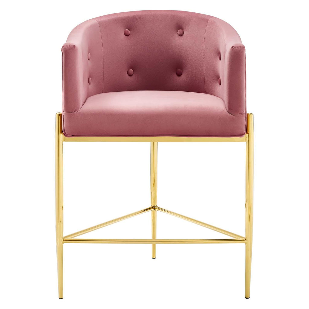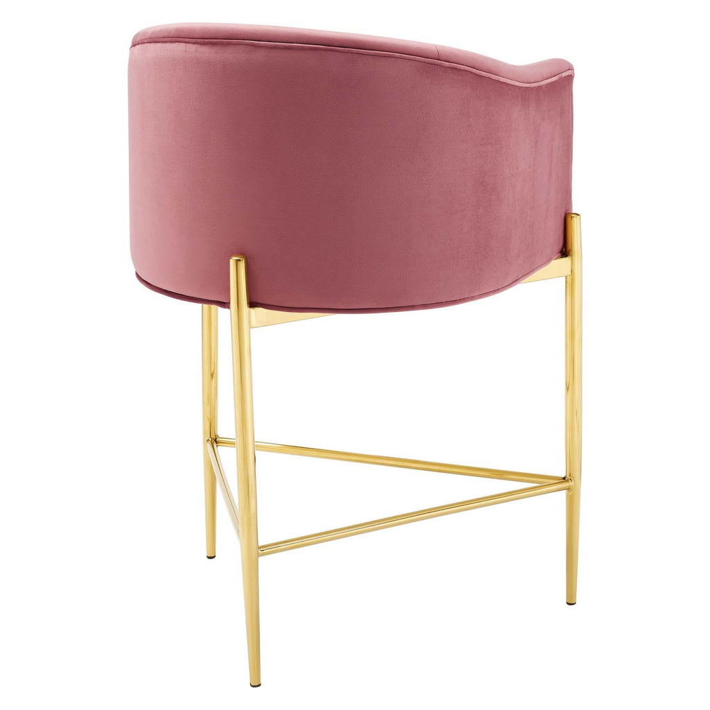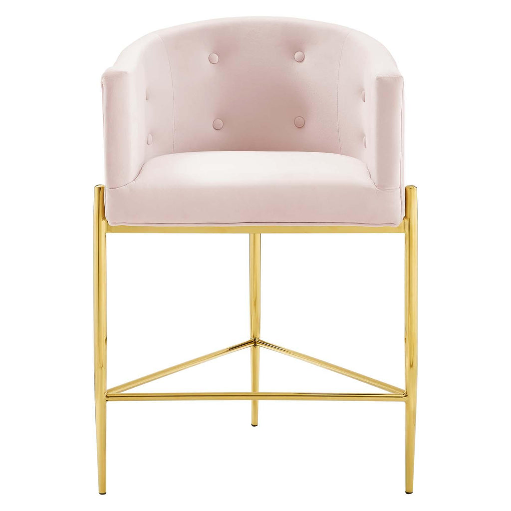 Bring luxe elegance to your dining room or kitchen space with the Savour Tufted Performance Velvet Counter Stool. Featuring a sweeping silhouette and updated club chair design, this velvet stool is suited for a counter-height pub table or kitchen island. This counter-height bar stool is upholstered in stain-resistant performance velvet upholstery and features dense foam padding to offer a comfortable seat while dining. Resting on a chrome gold tubular stainless steel frame, this versatile counter stool has interior button tufting and a charming curved shape. Seat Height From Floor: 26"H; Counter Bar Stool Weight Capacity: 300 lbs.