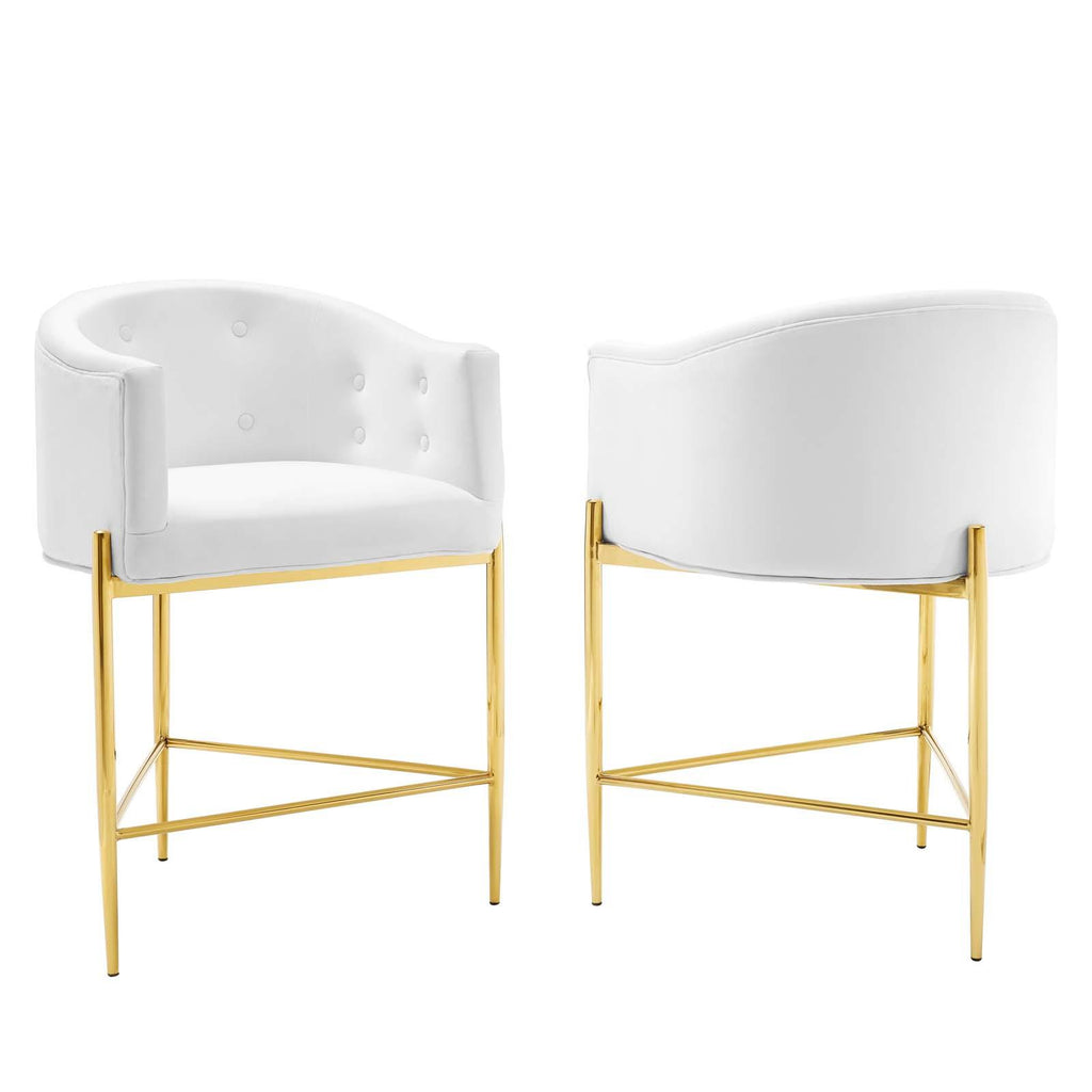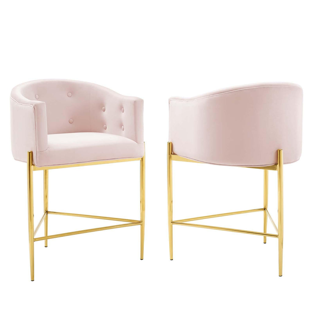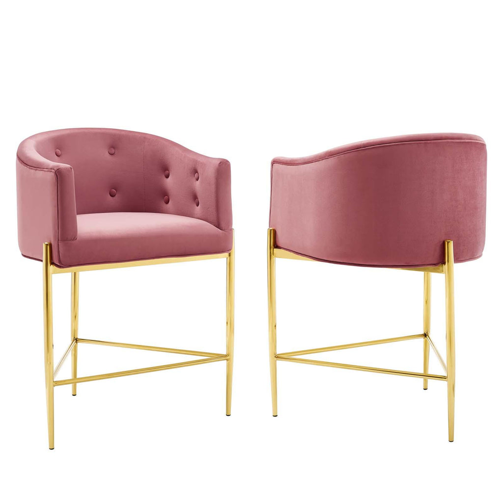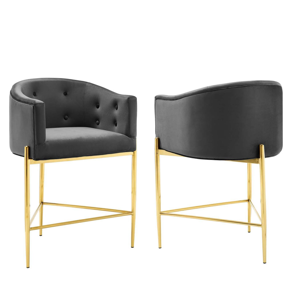 Bring luxe elegance to your dining room or kitchen space with the Savour Tufted Performance Velvet Counter Stool. Featuring a sweeping silhouette and updated club chair design, this velvet stool is suited for a counter-height pub table or kitchen island. This counter-height bar stool is upholstered in stain-resistant performance velvet upholstery and features dense foam padding to offer a comfortable seat while dining. Resting on a chrome gold tubular stainless steel frame, this versatile counter stool has interior button tufting and a charming curved shape. Seat Height From Floor: 26"H; Counter Bar Stool Weight Capacity: 300 lbs.