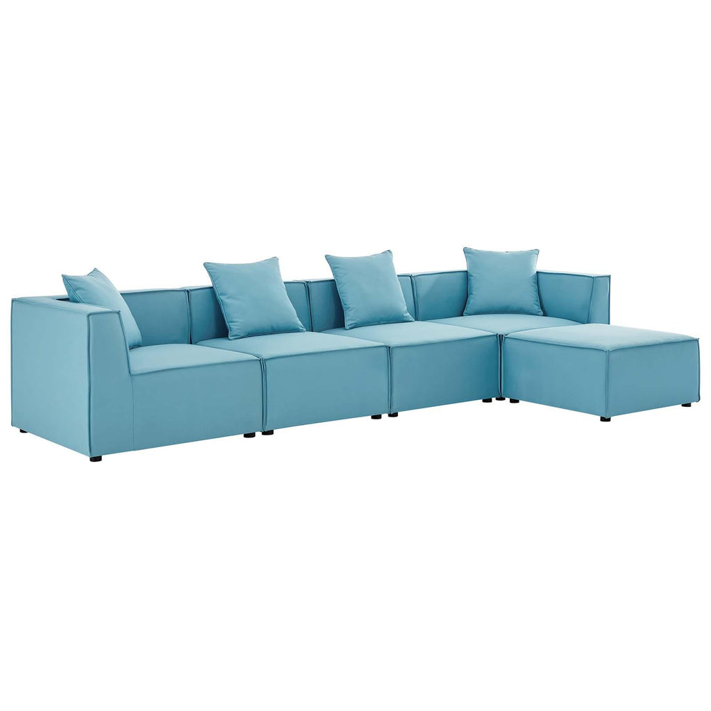 Bring relaxing comfort and modern style to your outdoor living space with the Outdoor Patio Saybrook Upholstered 5-Piece Sectional Sofa. Creating a custom seating area on your porch, deck, poolside, or patio, this all-weather patio sofa features a casual design accented by French piping details. This outdoor sectional sofa is complete with water and UV-resistant fabric upholstery, dense foam padding, and a sturdy aluminum frame with non-marking foot caps. Enjoy good weather and al fresco entertaining with the Saybrook Outdoor Patio Sectional Sofa Collection. Weight Capacity of Each Piece: 300 lbs.