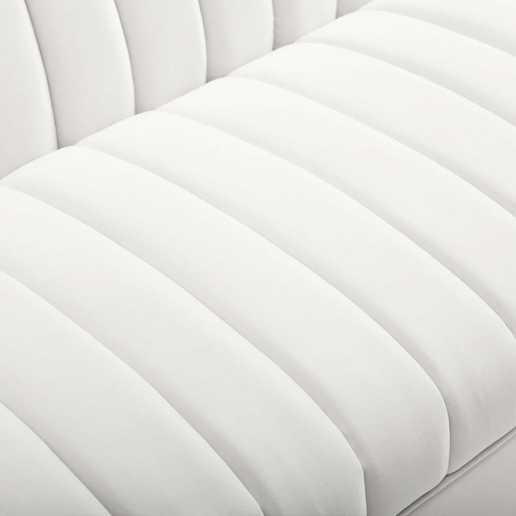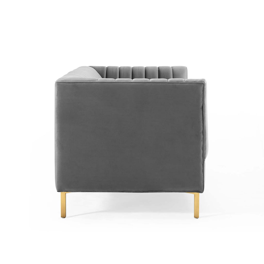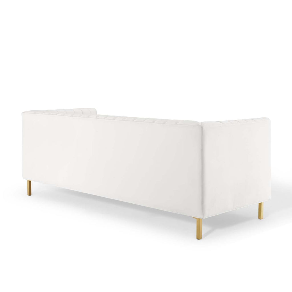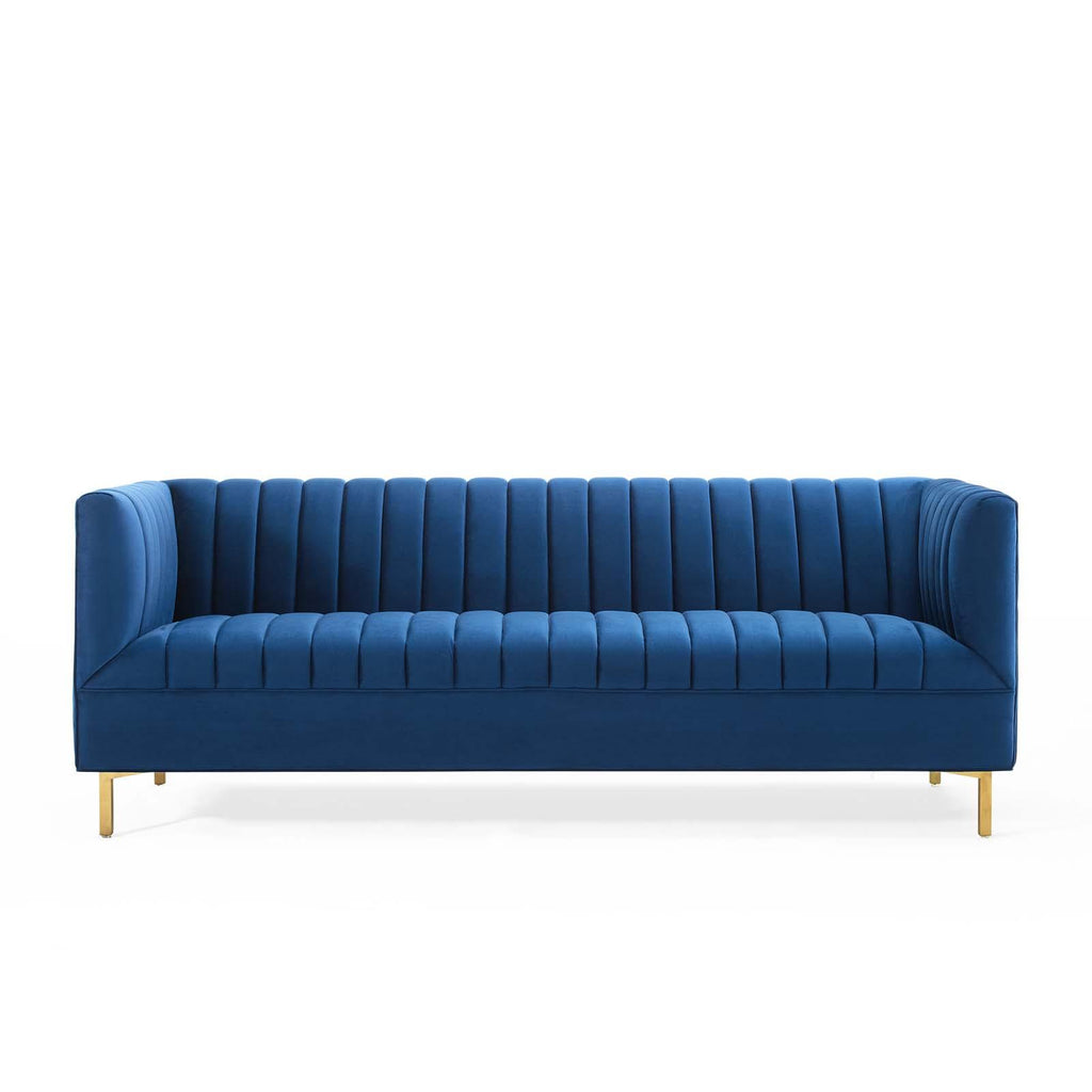 Engage the flowing lines of the Shift Channel Tufted Performance Velvet Living Room Sofa for a subtle elegance that enhances your living room decor. Shift features interior vertical channel tufted details that adds visual depth to this glam deco sofa. Luxuriously soft and stain-resistant performance velvet upholstery covers this living room sofa for an elegant piece at home in your living room, lounge room, or office seating area. The Shift Velvet Sofa rests securely on four gold stainless steel legs with non-marking foot pads to protect flooring. Assembly Required. Sofa Weight Capacity: 900 lbs. Set Includes: One - Shift Channel Tufted Sofa Glam Deco Sofa Performance Velvet Upholstery Channel Tufted Detail Stain-Resistant Fabric Stainless Steel Legs Assembly Required Chair Weight Capacity: 600 lbs. Overall Product Dimensions: 30.5"L x 77"W x 28.5"H Seat Dimensions: 21"L x 66.5"W x 17.5"H Backrest Dimensions: 66.5"W x 11"H Armrest Height from Seat: 11"H Leg Height: 5.5"H