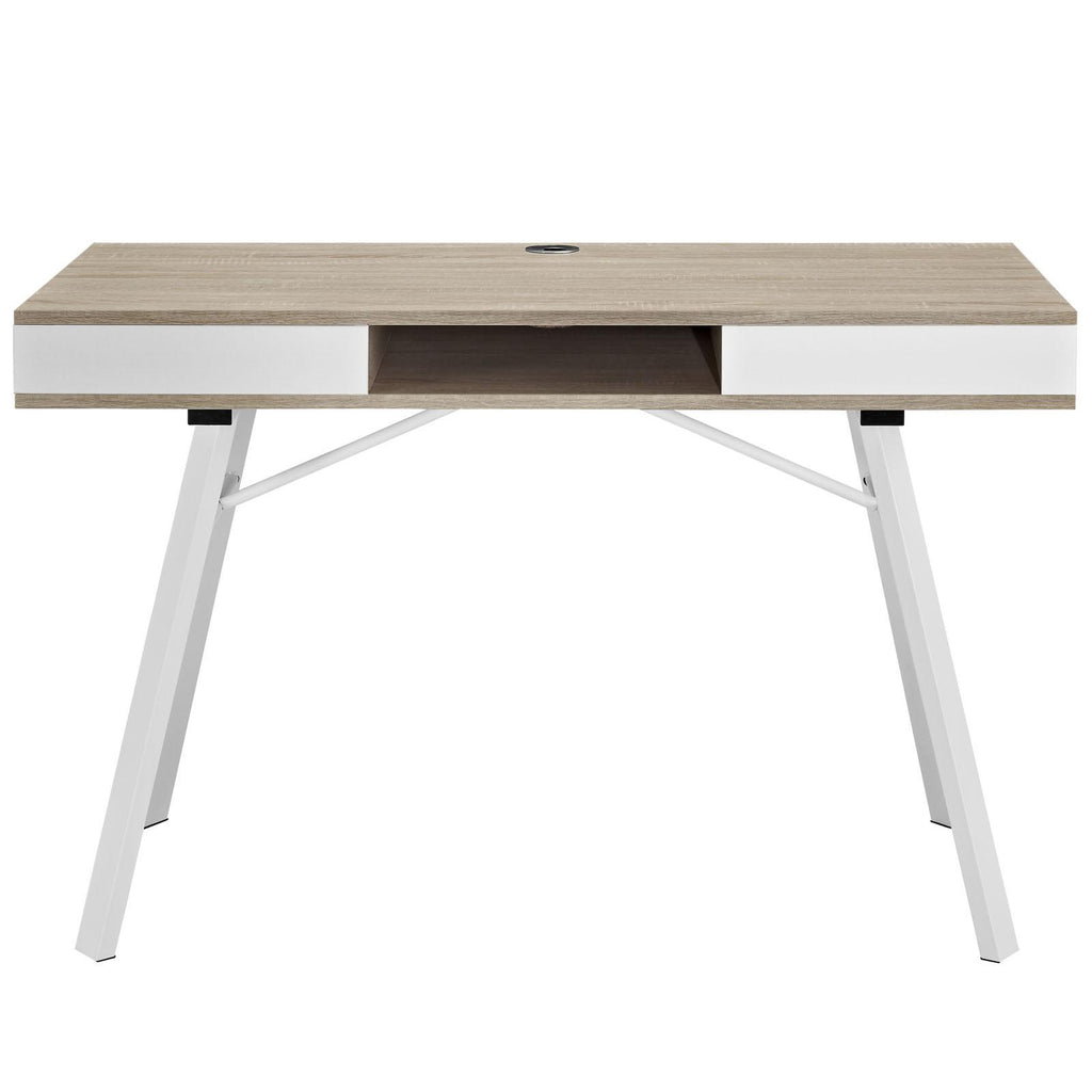 Just the right amount of activity complements the aesthetically calming Stir desk. Complete with easy-glide right and left storage drawers, a center cubby, and powder coated white steel A-frame legs, Stir is a compact piece that carries big rewards. Fully equipped with top and bottom reinforced cord holes, Stir doubles as either a computer or writing desk. The smooth melamine finish is patterned as wood-grained oak, giving the piece its overall soothing feel.