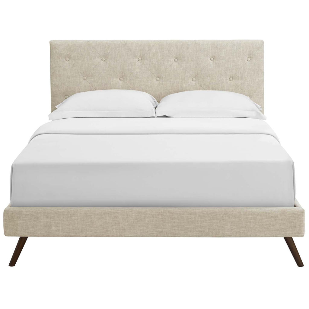 Accelerate your bedroom decor with the Tarah Platform Bed. Made with a solid wood frame upholstered in polyester fabric, Tarah features tapered wood legs, plastic foot glides, stylish headboard, and ten sturdy wood slats with a centered supporting bar and two support legs for enhanced stability. Due to the wooden slat support system, the use of a box spring is unnecessary. Tarah supports memory foam mattresses such as our Aveline series. Perfect for mid-century modern, minimalist and contemporary bedrooms. Mattress not included. Assembly Required. Set Includes: One - Loryn King Bed Frame with Round Tapered Legs One - Terisa King Headboard Fine Polyester Upholstery Ten Wood Support Slats Wood Frame / Particleboard Panel Center Rail with Support Two Legs Mounts in Four Locations Dense Foam Padding Non-Marking Foot Glides Overall Product Dimensions: 86"L x 79.5"W x 47.5"H Bed Inner Size: 77"L x 81.5"W Longboard Size: 81.5"L x 6"W x 1"H Shortboard Size: 79.5"L x 6"W x 2.5"H Overall Headboard Dimensions: 3"L x 79.5"W x 47.5"H