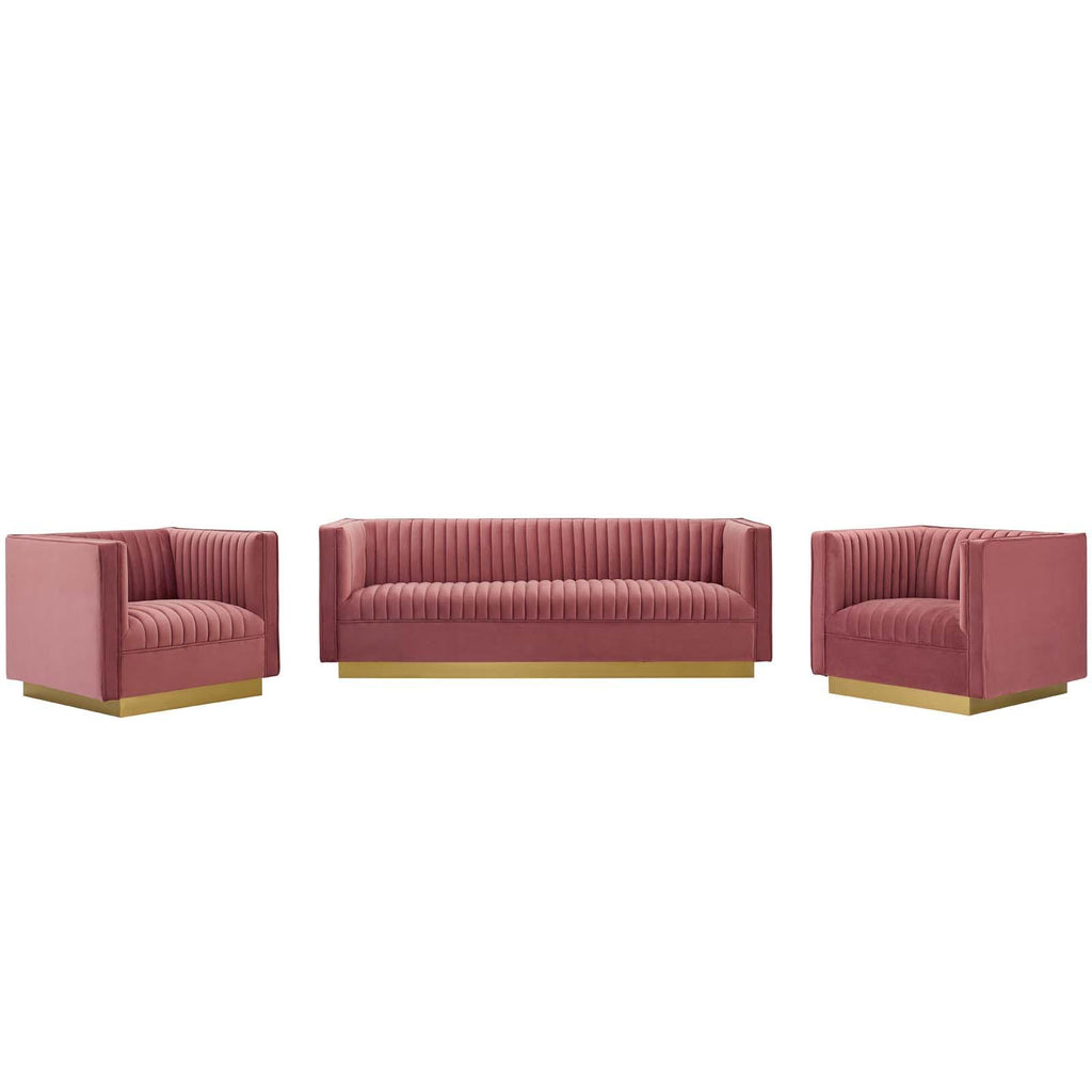 Glamour radiates from the organic linear design of the Sanguine Performance Velvet 3 Piece Set which includes Sofa and 2 Armchairs. Relax and follow the interior vertical channel tufting for a streamlined effect that adds retro modern glamour to your living room, lounge room, or home office. Soft, stain-resistant performance velvet upholstery creates a luxurious tactile experience while dense foam padding with individually wrapped spring coil system provides ultimate comfort and support. Sanguine�s palatial accents and premium comfort rest securely on a gold stainless steel base that complements any contemporary modern home or apartment.