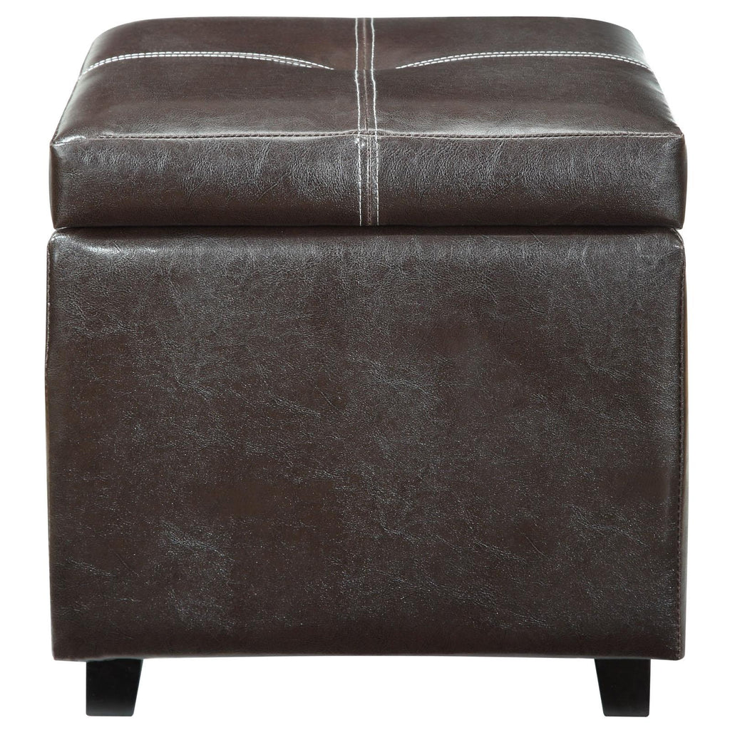 Keep your bounty close at hand with the Treasure Ottoman. A rich espresso finish with piped edging lends an Old World style to an otherwise modern piece. Prop your feet up, or stow away your possessions, with durable simplicity positioned on four wooden legs. Set Includes: One - Treasure Vinyl Storage Cube Ottoman Storage Ottoman Wood Composite Frame Padded Vinyl Wooden Legs Overall Product Dimensions: 17"L x 17"W x 17"H Seat Dimensions: 31.5"H Backrest Dimensions: 23.5"H Base Dimensions: 17"W Leg Dimensions: 1.5"L x 1.5"W x 2"H