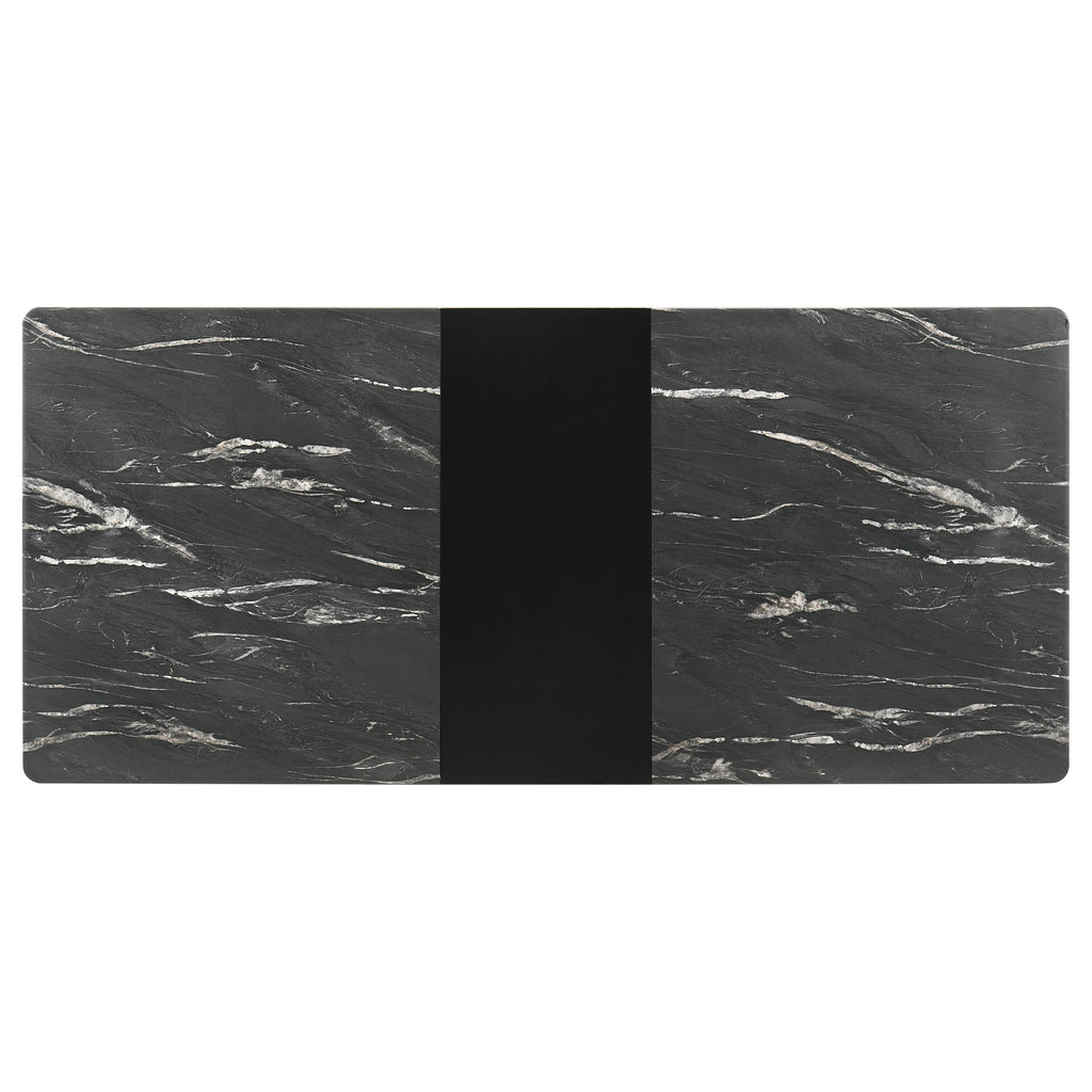 Envision your gatherings transformed with this exquisite dining set, where the sleek lines of modern design meet the timeless allure of faux marble. The table's luxurious black marble-esque top is a symphony of style, supported by fin-style legs that ground it with a touch of sophistication. As your ensemble grows with the seamless self-storing extension, the dining tableau adapts, offering a spacious stage for both feasts and intimate conversations. Accompanying the table, the Danish Y-shaped wishbone chairs, dressed in black and beige, whisper of coastal breezes and relaxed elegance, their form both a nod to tradition and a statement of contemporary grace. This dining set doesn't just host meals; it curates experiences. Key Features: • Elegant 5-piece dining set features a rectangular table with a striking faux marble top • Accommodates additional guests with a 16" self-storing leaf • Set includes six elegant wishbone side chairs in black with beige fabric cushions • The table's fin-style legs and chairs' tapered design provide a cohesive look • Both table and chairs boast durable construction, with materials chosen for longevity and ease of maintenance