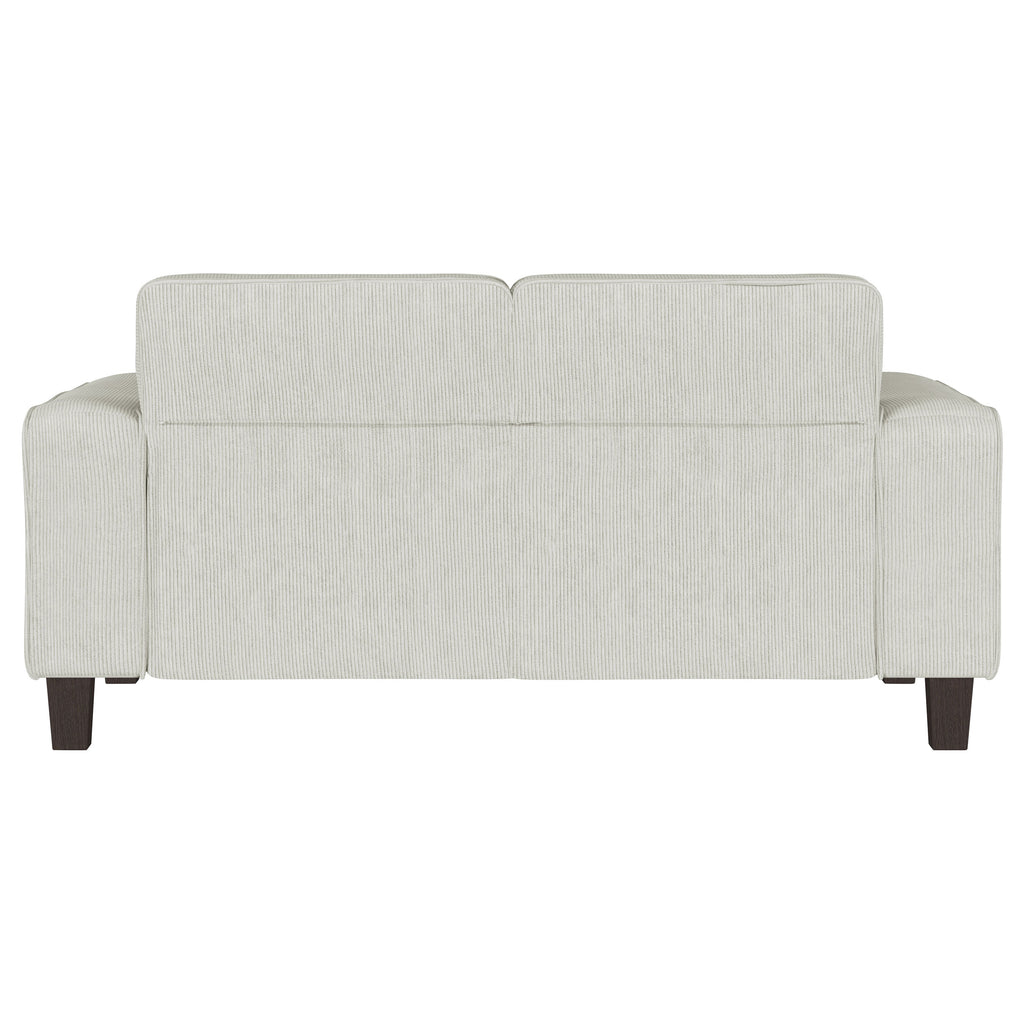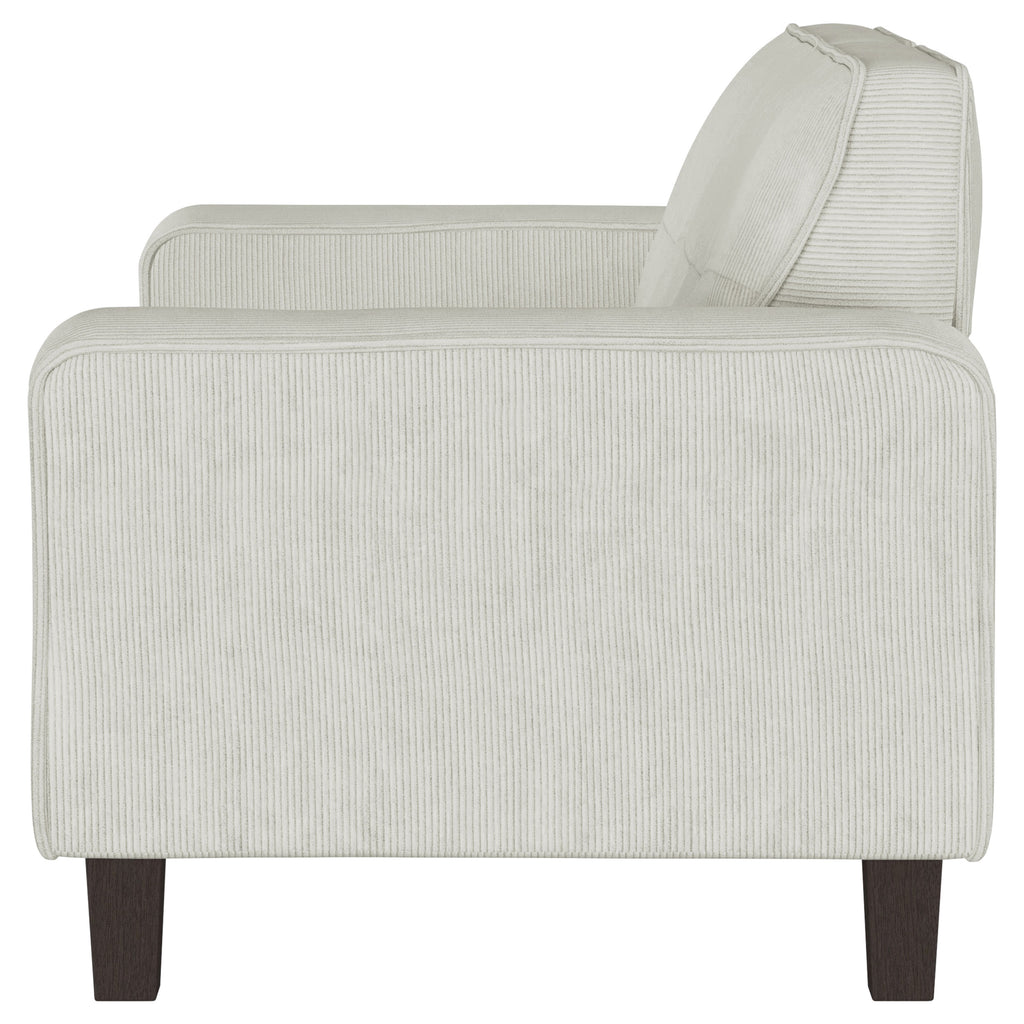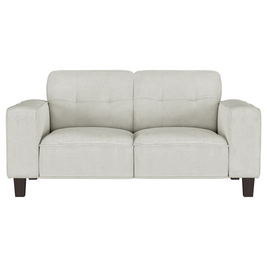 Inject impressive comfort and impeccable style with a modern loveseat in your living room or den. Its tufted back cushions add depth and dimension, perfect for a touch of character in your living area. Plush, soft upholstery in a neutral hue complements perfectly, offering inviting comfort and style with corduroy-like texture. Wide track arms add structure to a clean-lined silhouette, offering timeless flair that blends in any setting. Tapering wooden legs complete the look, offering height that create a touch of light, airy ambiance that delivers a modern design. Key Features: • A modern loveseat offers inviting flair with soft upholstery in a lovely neutral hue • Textured corduroy-style upholstery is extra plush for a cozy and inviting touch • Biscuit tufted back cushions create a stylish touch of texture and dimensionality • Wide track arms define a clean-lined silhouette that offers versatile style in any living space • Tall, tapering wood legs create light, airy lift, perfect for a modern living space • Seats feature sinuous springs and coils for optimal comfort and support