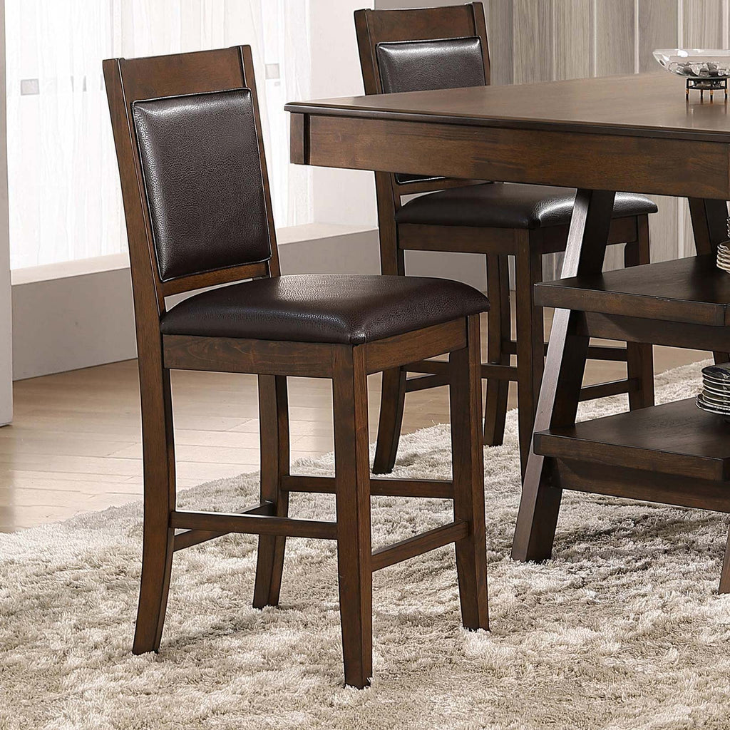 Blending timeless craftsmanship with modern comfort, this counter-height chair offers a sophisticated seating solution. Its rich walnut wood finish highlights the natural beauty of the rubberwood frame, while the padded seat and backrest provide luxurious support. Upholstered in smooth brown faux leather, it ensures durability and easy maintenance. A woven panel back detail adds texture and dimension, making this chair a standout piece for any counter or bar-height dining space. Key Features: • Counter-height chair designed with a sophisticated transitional aesthetic • Walnut wood finish enhances the rubberwood frame for lasting durability • Brown faux leather upholstery offers easy cleaning and a sleek appearance • Padded seat and backrest provide superior comfort and long-lasting support • Woven panel back detail creates a stylish, textured visual accent • Sturdy tapered legs with footrests ensure maximum stability and strength