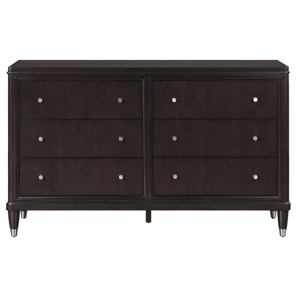 Introduce stylish storage in your bedroom with a modern six-drawer dresser. Its sleek look is accentuated in a dark brown finish, with metallic accents that add depth to tapering feel. Petite knobs decorate each drawer front as drawers offer ample storage for clothing, linens and accessories in your bedroom. The dresser offers a wide top for decor and drawers add protection with felt lining in top drawer and cedar lining and bottom drawers. Add framed photos or a metal sculptural piece to the top of the dresser to add a personal touch. Key Features: • A contemporary six-drawer dresser offers stylish clothing and accessory storage and a refined look • Rich brown wood finish creates a neutral, sophisticated for a stylish bedroom ambiance • Tapering feet feature metallic finish caps that match round knobs on the drawers • Top drawers include felt lining in a red-brown color for added protection for delicate items • Bottom drawers include cedar lining to protect against pests