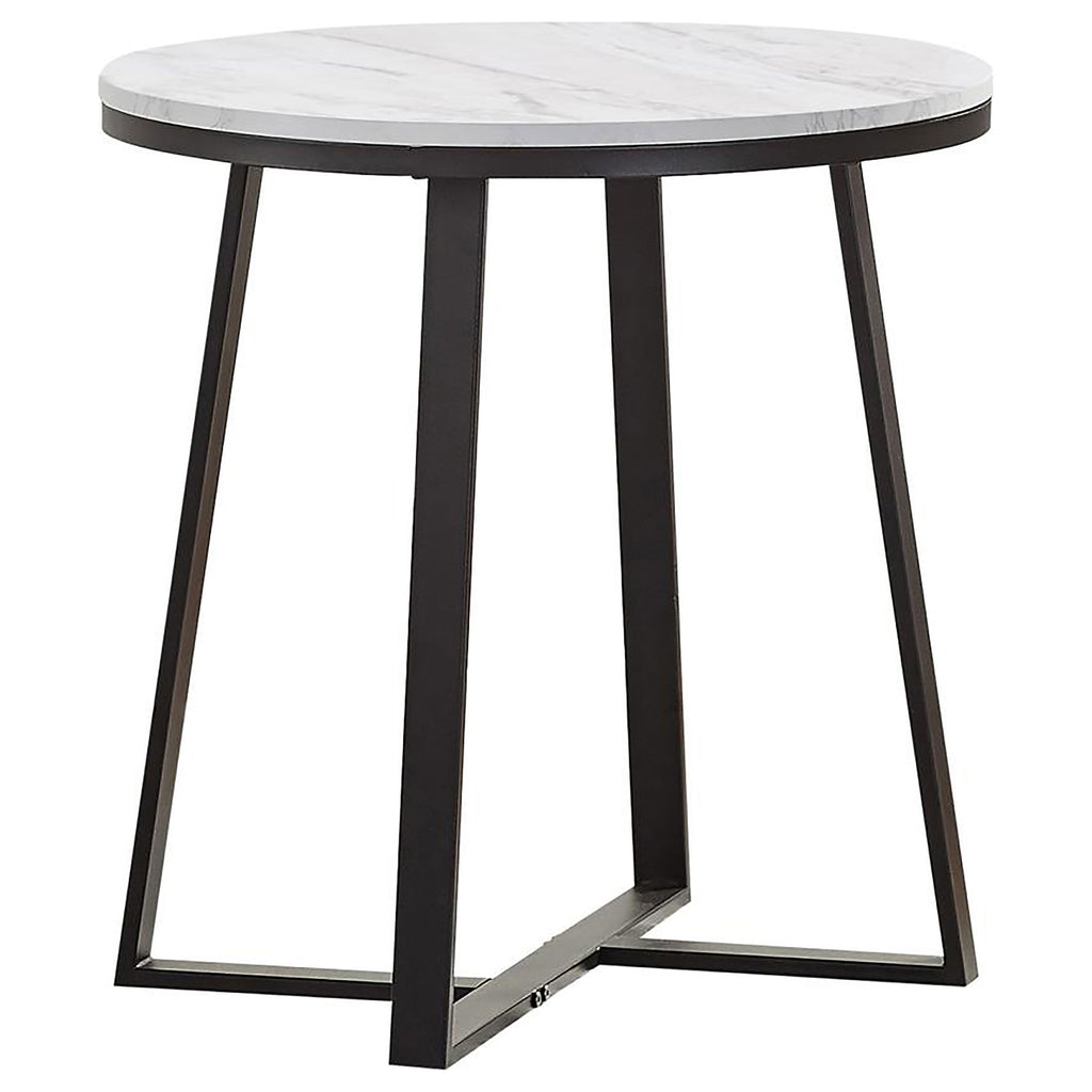 This modern end table combines bold design with a sleek two-tone finish, ideal for contemporary spaces. The round faux marble top in white adds elegance, while the matte black powder-coated metal base offers a sturdy foundation. The intersecting U-shaped legs create a geometric silhouette that enhances its visual appeal. Crafted from engineered wood, PVC laminate, and heavy-gauge metal, this end table is durable and stylish. Perfect for showcasing decor or serving as a versatile accent piece. Key Features: • Round end table with a two-tone design ideal for modern and contemporary spaces • White faux marble tabletop adds an elegant, refined look with subtle grey accents • Intersecting U-shaped legs bring bold, geometric style to your room's decor • Sturdy metal base features a matte black powder-coated finish for lasting durability • Built from engineered wood, PVC laminate, and heavy-gauge metal for solid construction • Perfect for use as a functional and decorative accent piece in any space