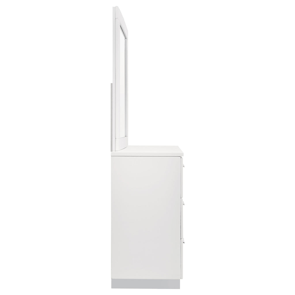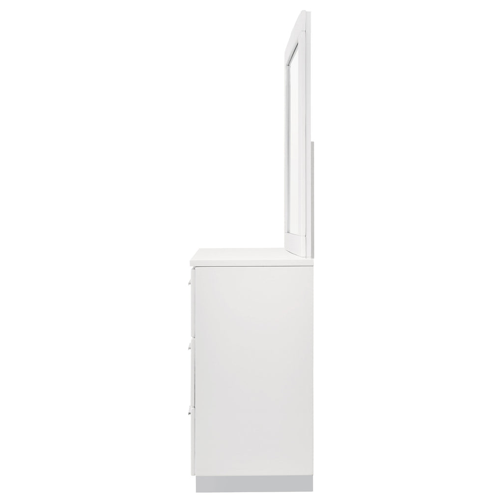 This dresser and mirror set brings streamlined function to contemporary bedrooms. The six-drawer dresser offers ample storage with smooth metal extension glides, while the mirror features a white high gloss frame that reflects light and complements the dresser’s modern silhouette. Chrome-finished handles and feet enhance the look with refined detail, making this set a practical yet stylish addition to your space. Key Features: • Modern dresser and mirror set featuring sleek, clean-lined contemporary design • Dresser finished in white high gloss for a crisp, bright, and polished appearance • Six spacious drawers offer ample room with smooth metal extension glides • Mirror includes a rectangular frame finished in matching high gloss white • Chrome-finished metal handles and feet provide refined, modern contrast • Built for durability and functionality in today’s stylish bedroom interiors