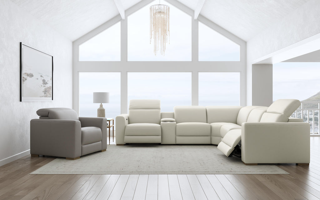 The luxurious look of upscale stationary furniture combineswith functional adjustability with the Aurora power reclining sectional with power headrests. Transform your living space into a stylish oasis for relaxation and surround yourself in contemporary comfort with design features such as soft, wide track arms and a low profile, stationary look with motion functionality. The power recline and headrests help you achieve maximum relaxation, while Zero Gravity technology gives you a feeling of weightlessness. Useful features such as charging ports and a storage console offer added convenience of keeping mobile devices powered and drinks close at hand. Upholstered in two neutral color choices of durable top-grain leather, the Aurora power reclining sectional serves as a beautiful complement to any home.