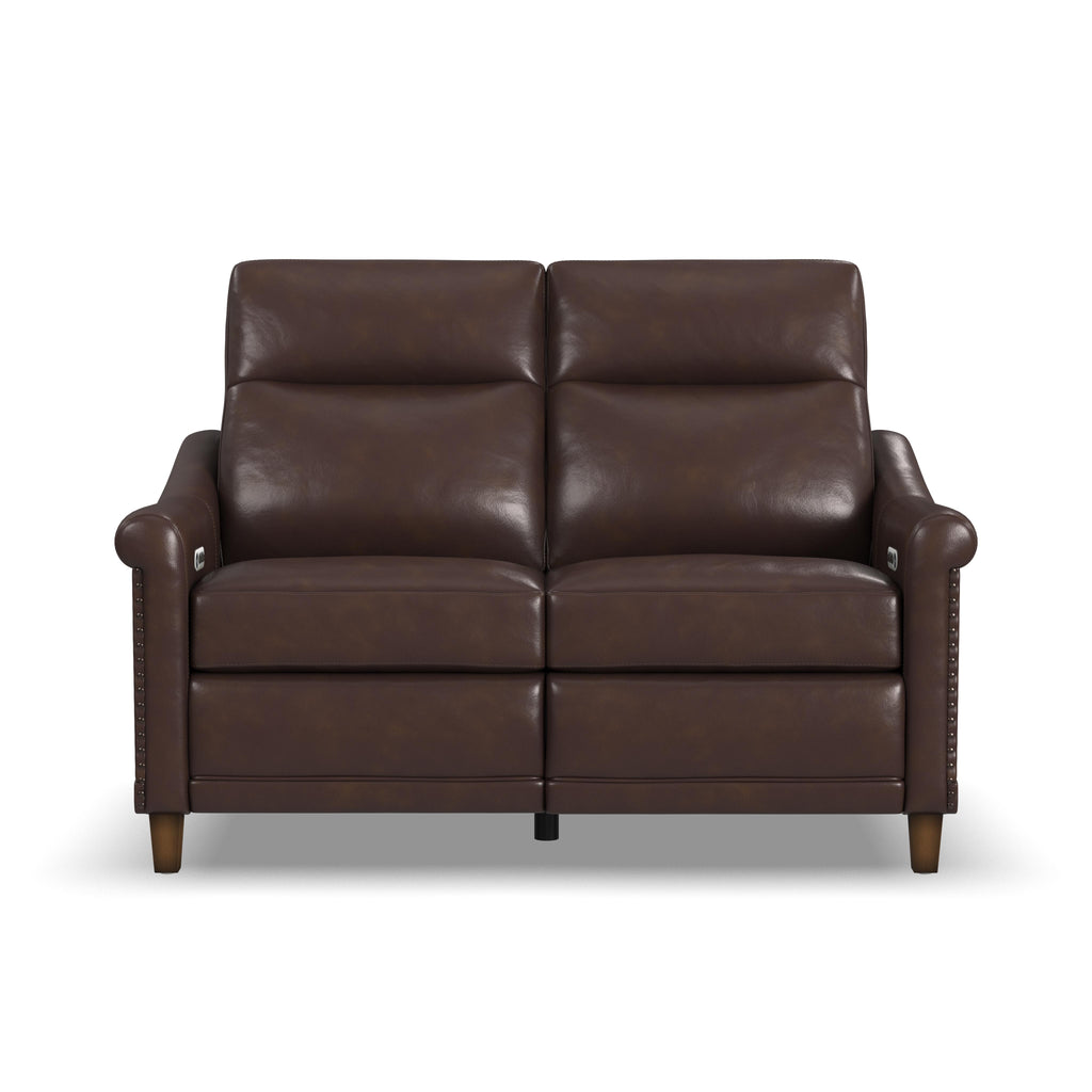 Timeless, traditional details meet todayÕs modern comfort capabilities with the Elizabeth leather power reclining loveseat. Inspired by vintage stationary furniture, this loveseat features sloped, petite roll arms, curved side base rails and decorative nailhead trim reminiscent of a bygone era. A high-divide back, extended footrests and powered headrests provide support for complete relaxation. Upholstered in a buttery-soft, durable, brunette brown leather, the Elizabeth loveseat exudes elegance and luxury.