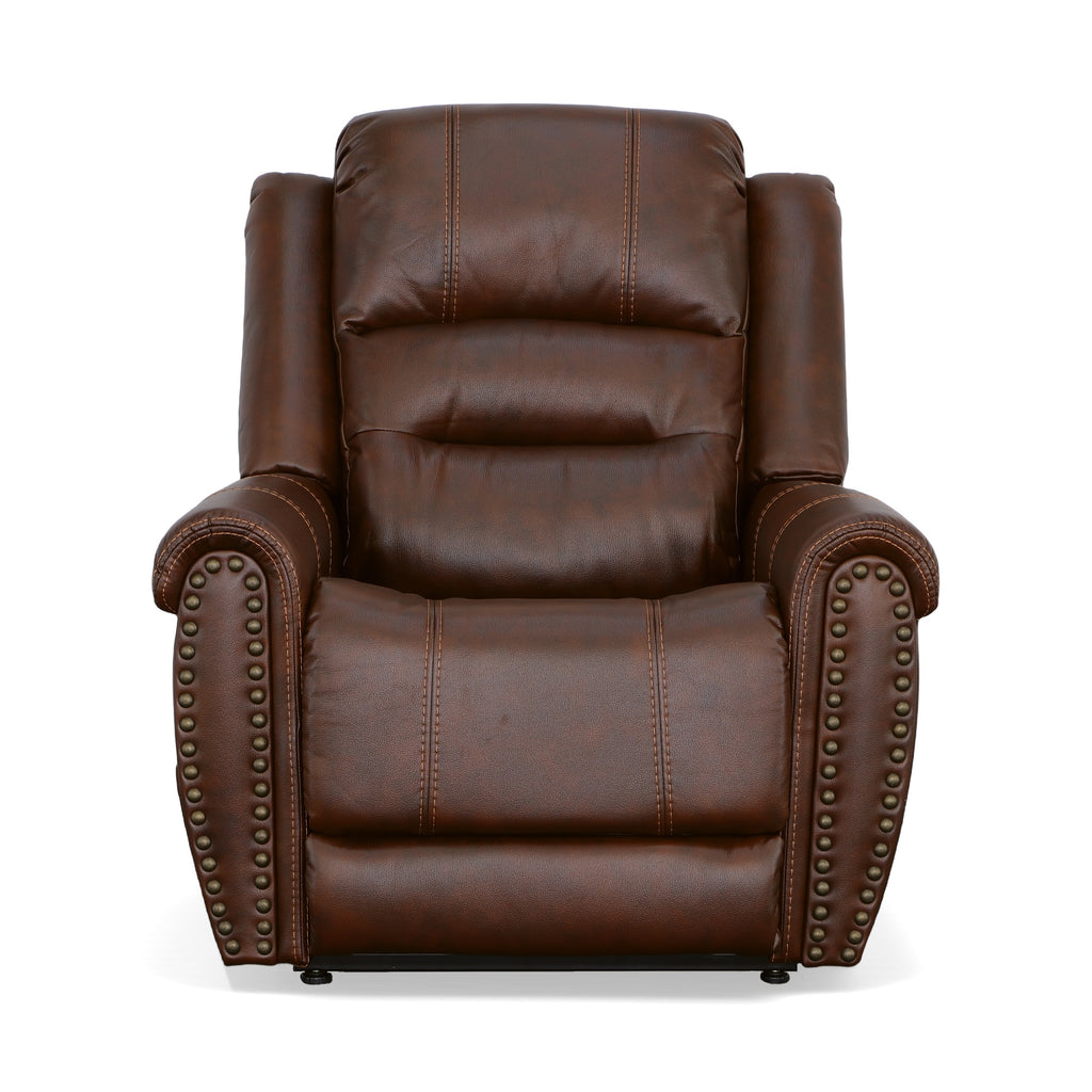 The generous padding and heavy-thread stitching detail of the Oscar power lift recliner with power headrest instantly grabs your attention and welcomes you to take a seat. Nailhead trim traces the edges of the arm fronts to highlight the welcoming silhouette, while an extended footrest provides additional leg rest space for taller users. Customize your sit with power recline and headrest that can be adjusted at the touch of a button. Power lift provides easy and safe assistance when getting in and out of the chair. Outfitted in a medium-toned, pumpernickel brown fabric, this recliner brings a leather look to your room with the softness and comfort of fabric.
