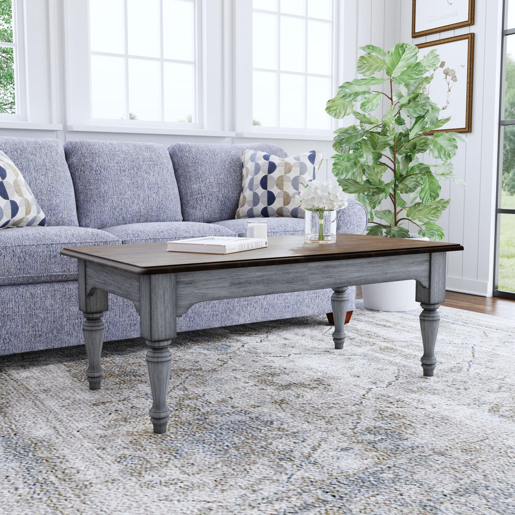 Transform your living room into a cozy cottage retreat with the Plymouth rectangular coffee table. A weathered graywash finish, medium brown planked top and turned legs create a charming vintage vibe, while the large tabletop provides ample area to place drinks and dŽcor.