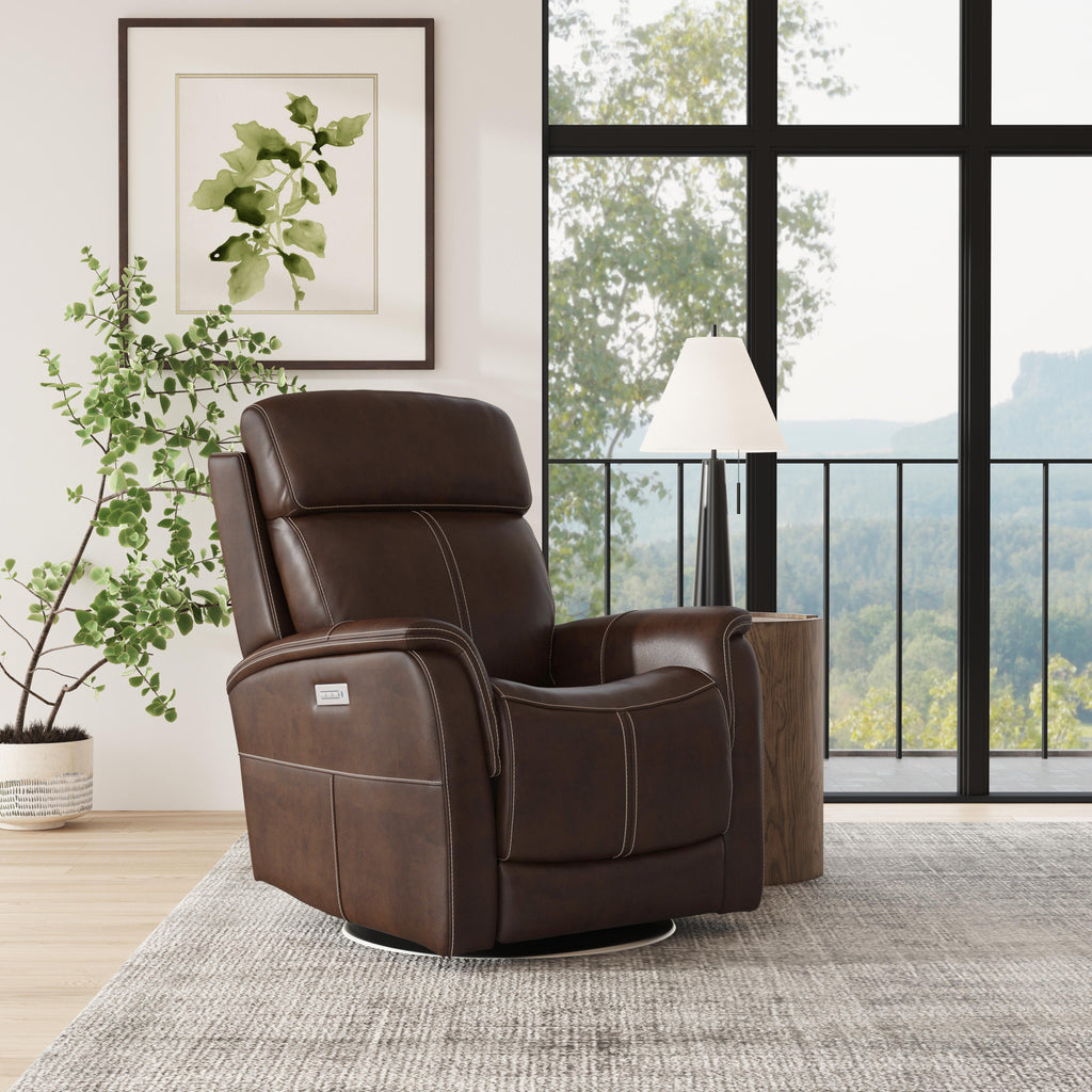 Enjoy an extensive range of motion in a chair that looks as good as it feels with the MOV 360 Degree recliner. Whether you are gaming, chatting or watching a movie, you can stay active as you sit with help from a swivel that rotates a full 360 degrees. Pad-over arms are paired with a divided backrest for head and lower back support, while an extended footrest accommodates taller users. Flexsteel's patented Blue Steel Springª seat system provides long-lasting seat support that you can count on. Move seamlessly from sitting to fully reclined with a power button that allows you to customize your comfort. Upholstered in a premium, dark blue split/grain leather with a welt trim and heavy thread top-stitching for a refined look, Degree is sure to make a statement in your home.