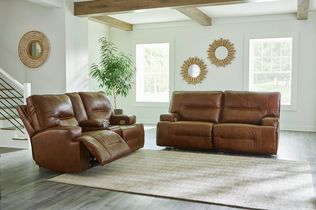 Master statement-making contemporary comfort with this power reclining package. It displays striking yet streamlined profiles, with auburn-hued leather in the spacious seating areas balancing natural beauty and refined design. Adjustable headrests and USB charging polish off this richly crafted set.