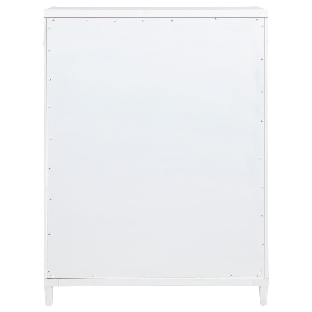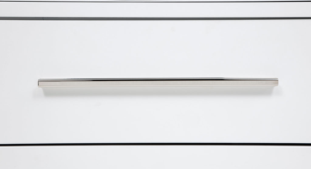 This five-drawer chest blends soft curvature with bold contemporary details for a refined bedroom centerpiece. Elongated brushed nickel pulls and sleek metal tube accents lend a striking gleam, while rounded corners offer a softened modern edge. Crafted from solid rubberwood, engineered wood, and fabric-lined interiors, each drawer glides smoothly on heavy-duty metal runners. A perfect fusion of design and daily utility, it’s ideal for modern spaces of any style. Key Features: • Five-drawer chest with curved edges and clean profile for modern bedroom storage • White finish complements brushed nickel pulls and metal tube detailing • Felt-lined top drawer with tinted interior and dovetail joints for refined function • French dovetail front and English dovetail back drawers glide on 45mm metal runners • Constructed from solid rubberwood, engineered wood, and soft fabric lining • Fully assembled design includes tip-over restraint system for added safety