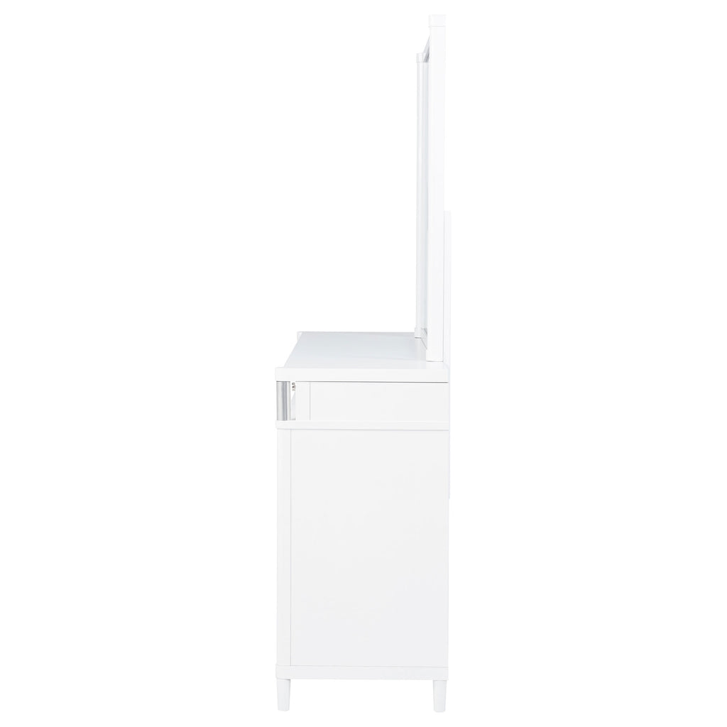 This eight-drawer dresser and mirror set captures contemporary elegance through subtle curves and polished detail. Elongated brushed nickel pulls and sleek metal tube accents highlight the silhouette, while the framed mirror adds dimension and balance. Made from solid rubberwood, engineered wood, and a smooth laminate veneer, the dresser drawers glide on heavy-duty tracks and feature felt-lined top compartments for added refinement. Key Features: • Eight-drawer dresser with framed mirror and soft, contemporary rounded silhouette • White finish pairs with brushed nickel handles and sleek vertical tube accents • Top drawers include felt lining and tinted interiors with dovetail construction • French dovetail front and English dovetail back glide on 45mm metal runners • Constructed from solid rubberwood, engineered wood, and laminate veneer • Mirror attaches securely to dresser; tip-over restraint system included