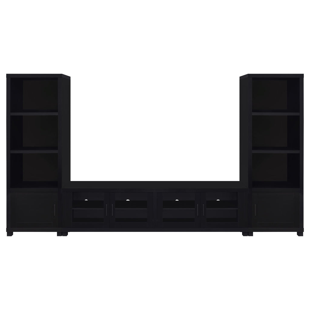 Transform your living room into the ultimate entertainment hub with this sophisticated three-piece entertainment center. Anchored by a commanding 79-inch TV stand, this set is designed to accommodate up to an 85-inch television, bringing a cinematic experience right into your home. The TV stand features four doors that open to adjustable shelves, perfect for organizing your media devices, gaming consoles, and more. Flanking the TV stand, two sleek media towers offer additional storage and display options, with open shelving for your favorite books and decor, and a concealed cabinet for hidden storage. Finished in a striking black hue, this entertainment center blends modern elegance with functional design, creating a seamless and stylish focal point in your living space. Key Features: • Three-piece entertainment center includes a 79-inch TV stand and two media towers • TV stand accommodates up to an 85-inch television, offering a grand viewing experience • Four-door TV stand with adjustable shelves for tailored media storage • Media towers feature three open shelves and a single-door cabinet for versatile storage • Sleek black finish adds modern elegance to any living room