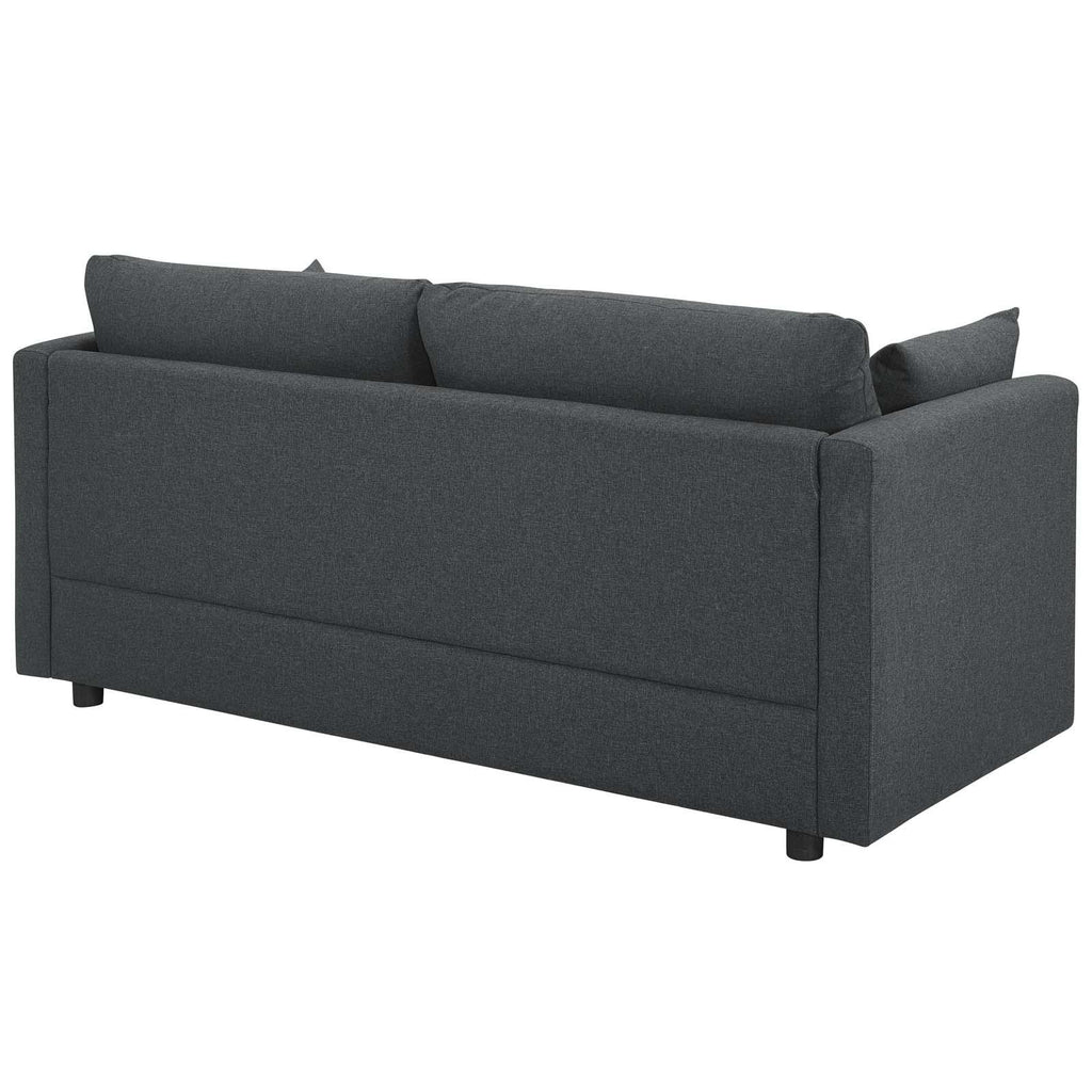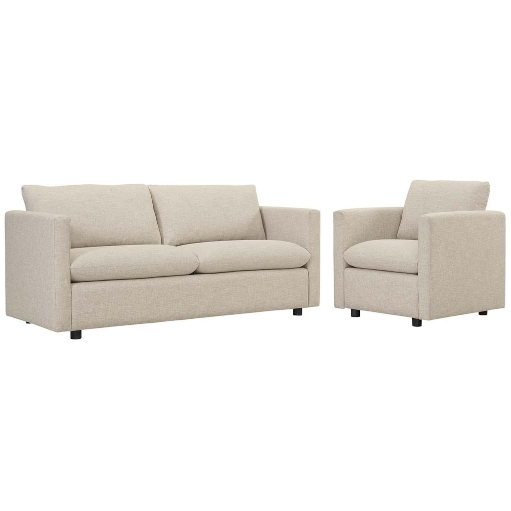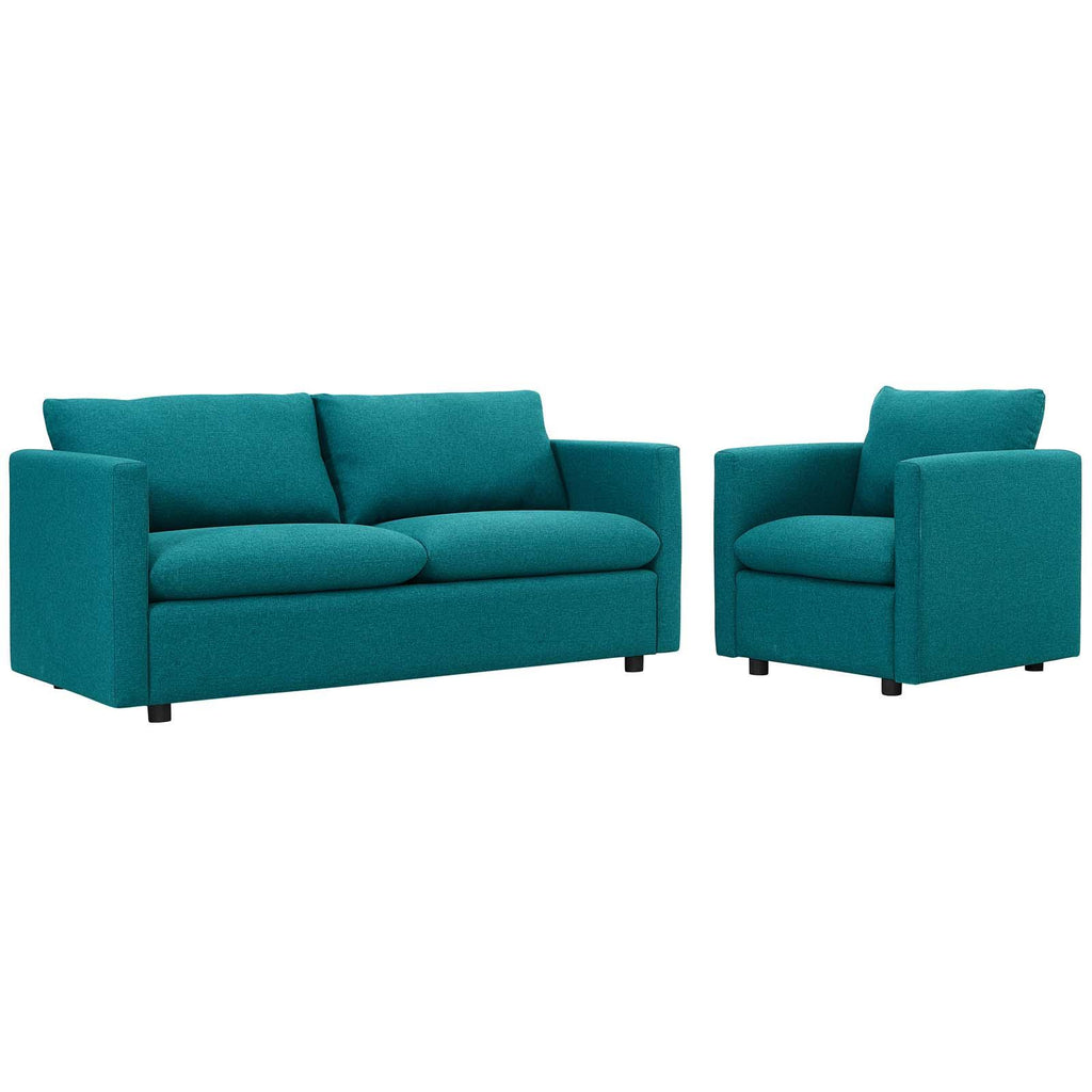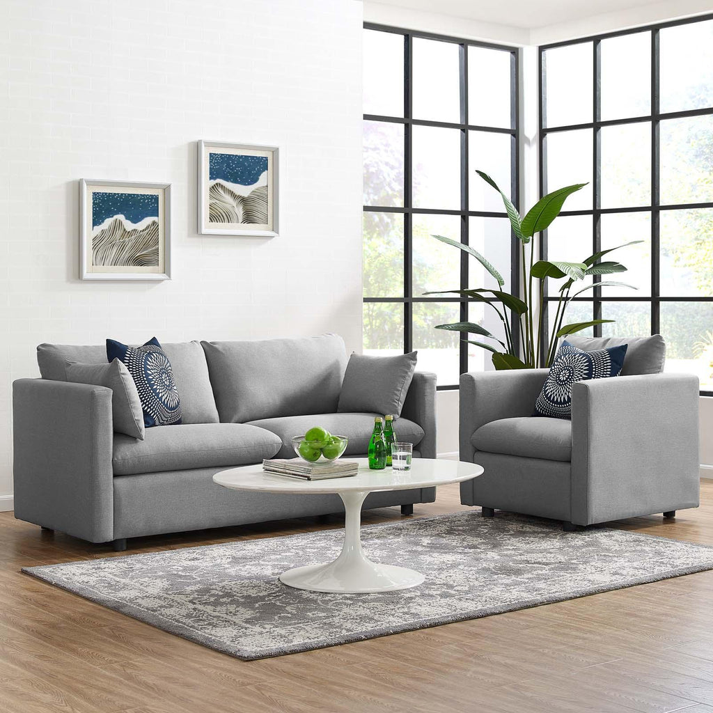 A versatile addition to a family room, apartment, or office, the Activate Upholstered Fabric Sofa and Armchair Set is a cozy modern set made with dense foam padding, and upholstered in soft polyester fabric. Rounded cushion corners and complementing accent pillows grant this sofa a contemporary look that�s echoed by its calming color, streamlined profile, and subtle wood legs. Say goodbye to the days of hauling heavy furniture with a casual yet tailored aesthetic, this living room set easily unpacks to become a favorite lounge spot in your home.